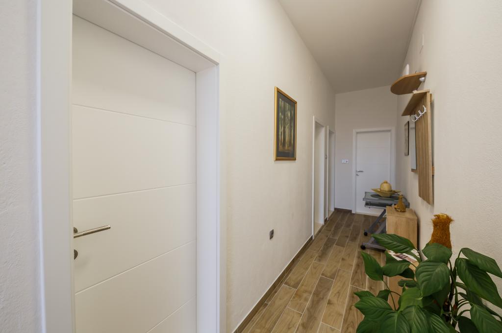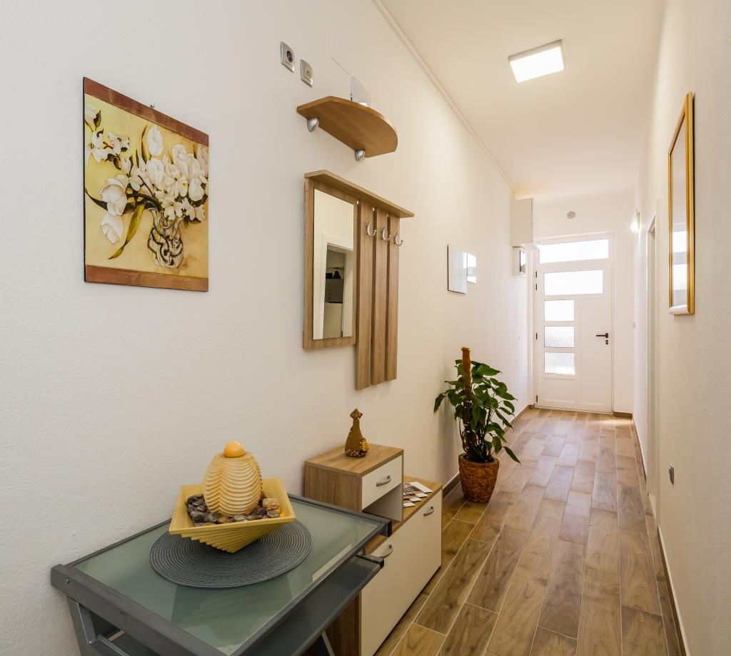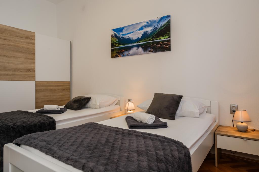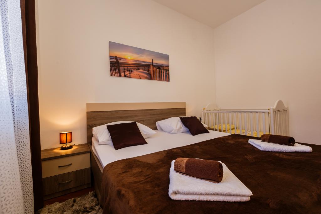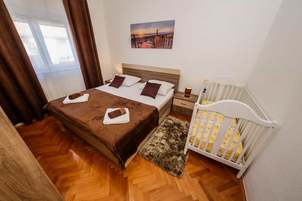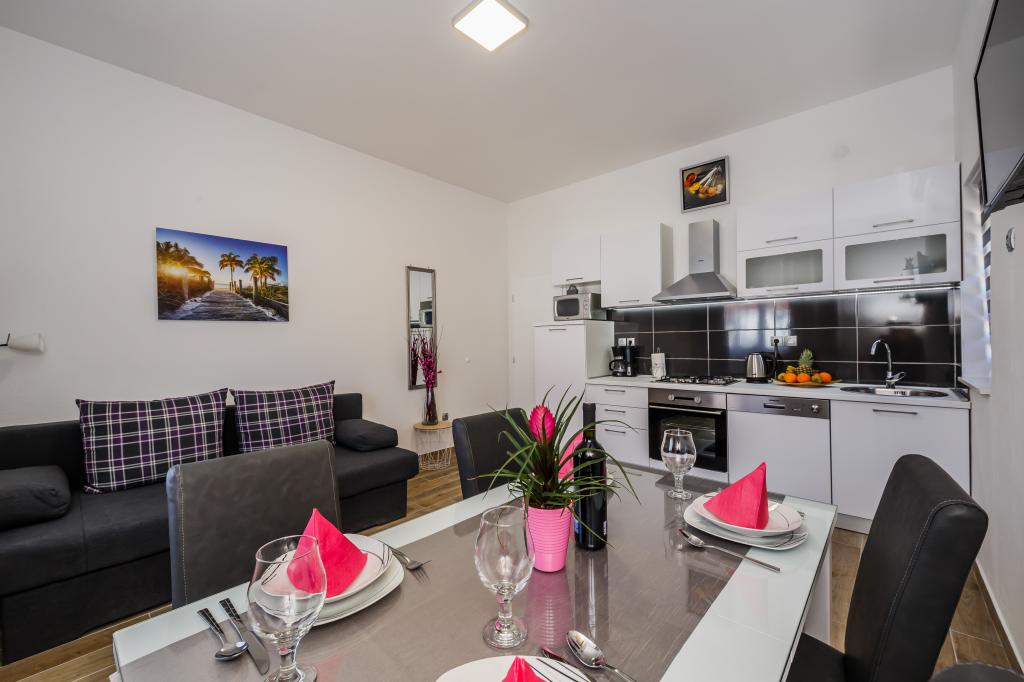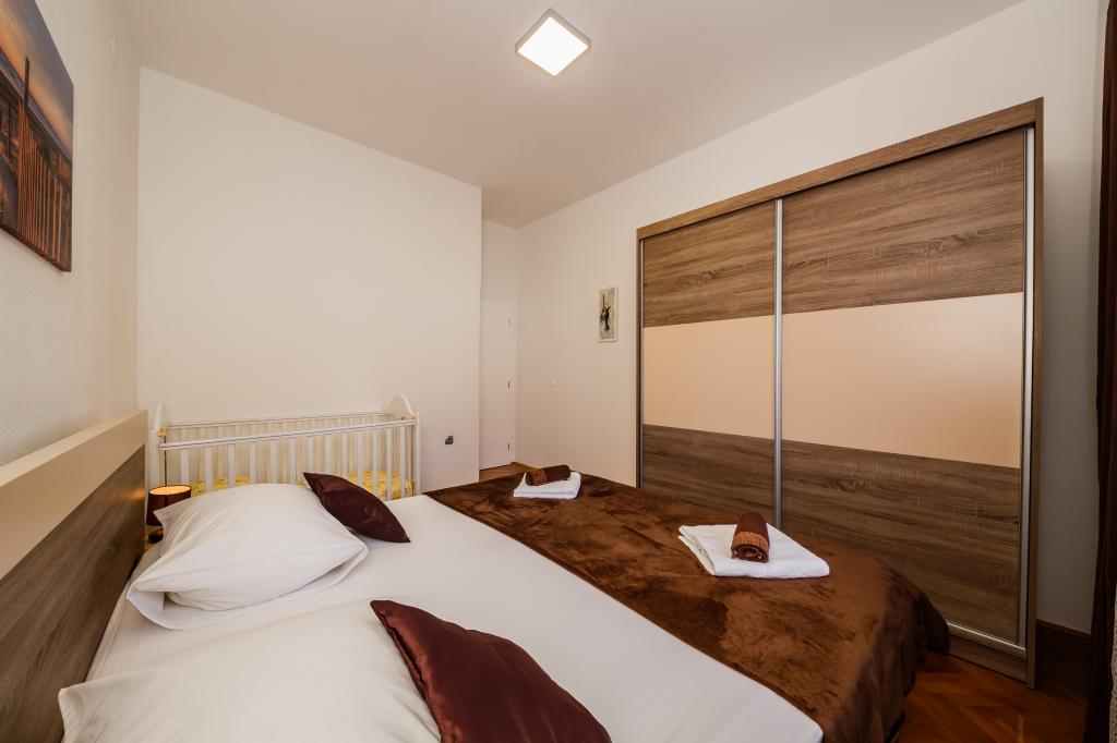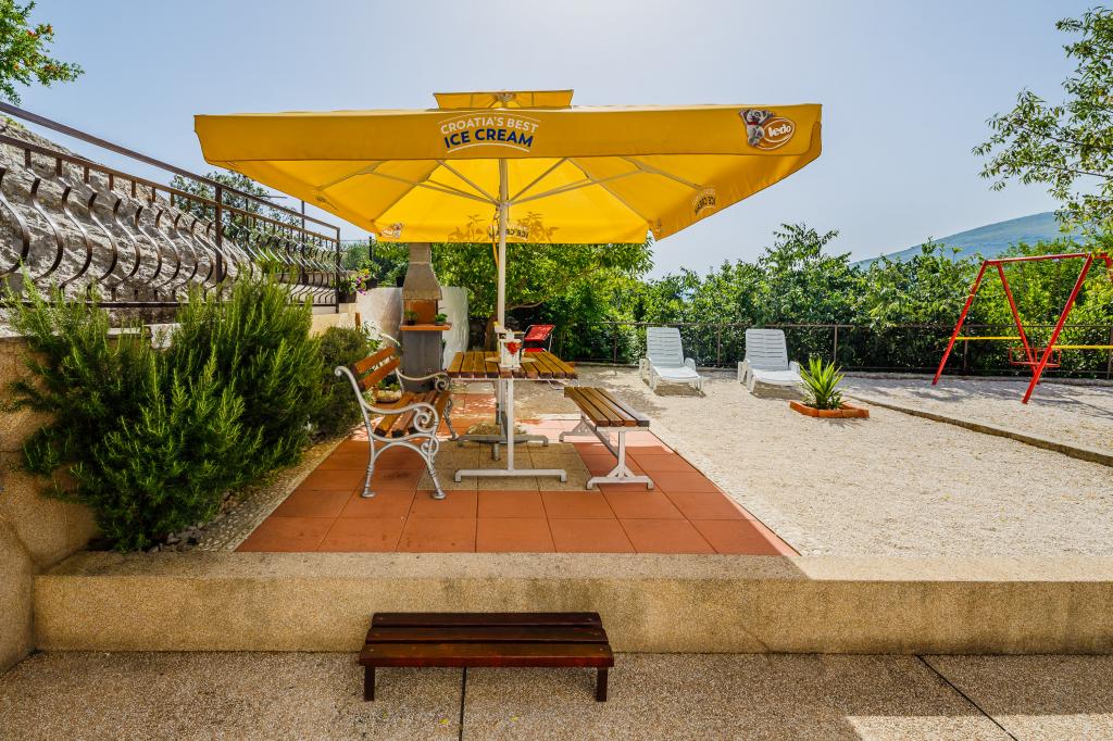 Mieszkanie położone jest na wyspie Ciovo, w odległości 300 metrów od centrum miasta i 600 metrów od plaży. Apartament jest w pełni wyposażony w dwie sypialnie, pokój dzienny, kuchnia, WC. Wielkości 75 metrów kwadratowych, obejmuje bezprzewodowy dostęp do Internetu, klimatyzację, dwa LCD, telewizję satelitarną z 500 kanałów. Apartament posiada taras z widokiem na ogród, plac zabaw (zjeżdżalnia, huśtawka, huśtawka), grill i Trogir. Bezpłatny parking znajduje się w pobliżu mieszkania.