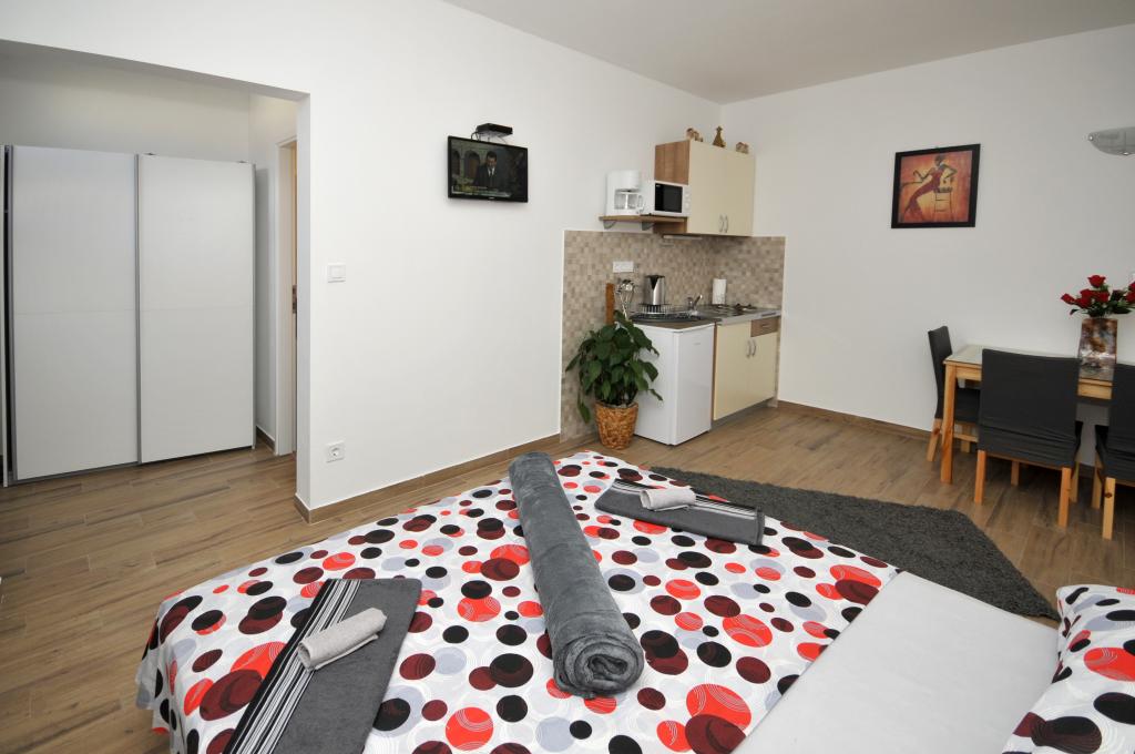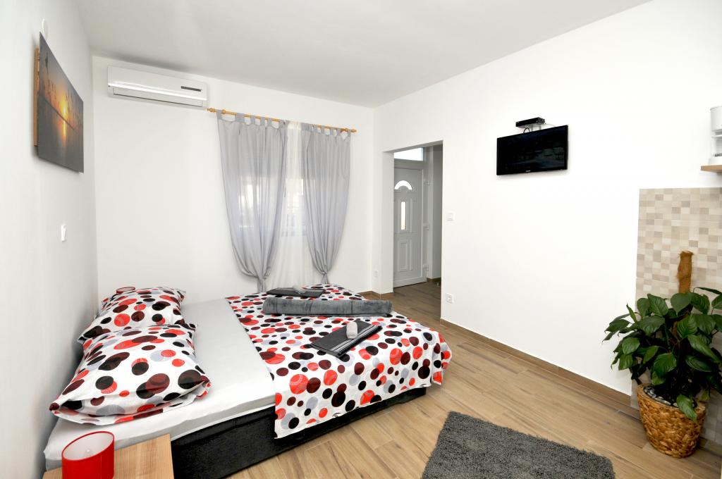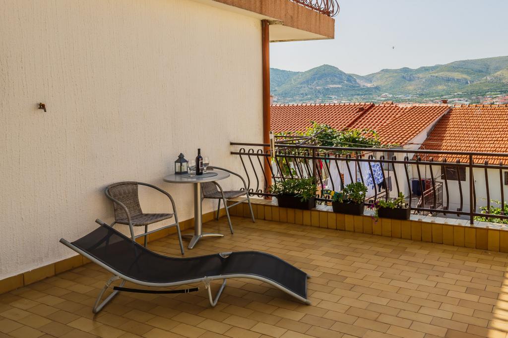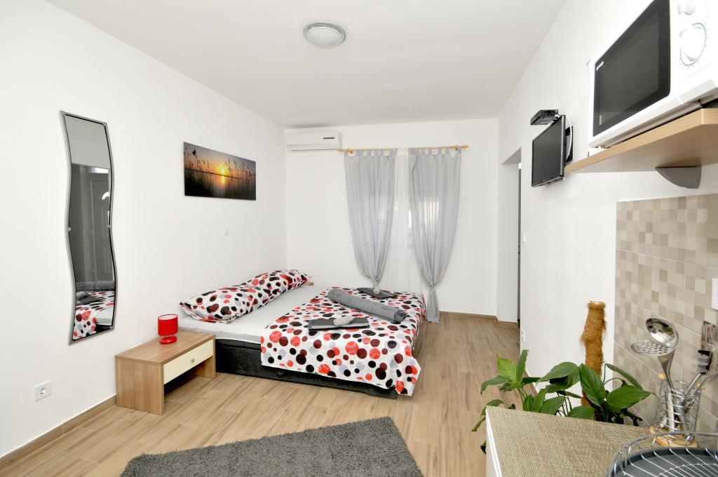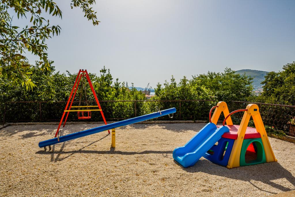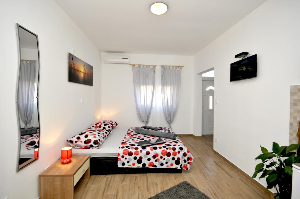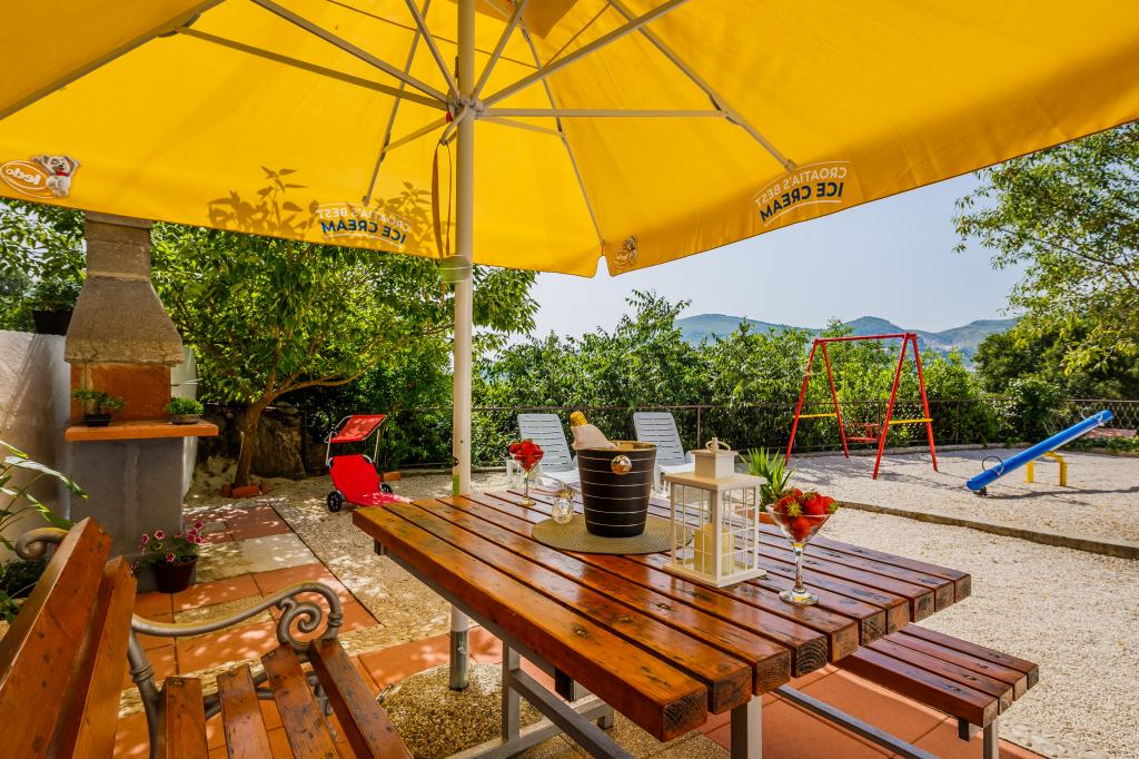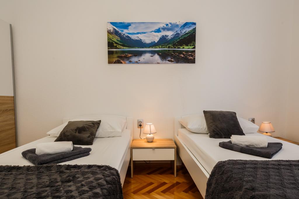 Mieszkanie położone jest na wyspie Ciovo, w odległości 300 metrów od centrum miasta i 600 metrów od plaży. Apartament jest w pełni wyposażony w dwie sypialnie, pokój dzienny, kuchnia, WC. Wielkości 75 metrów kwadratowych, obejmuje bezprzewodowy dostęp do Internetu, klimatyzację, dwa LCD, telewizję satelitarną z 500 kanałów. Apartament posiada taras z widokiem na ogród, plac zabaw (zjeżdżalnia, huśtawka, huśtawka), grill i Trogir. Bezpłatny parking znajduje się w pobliżu mieszkania.