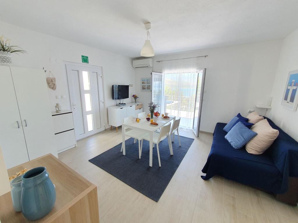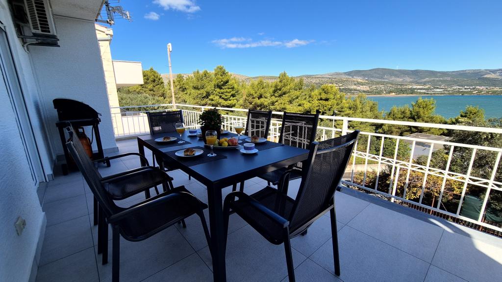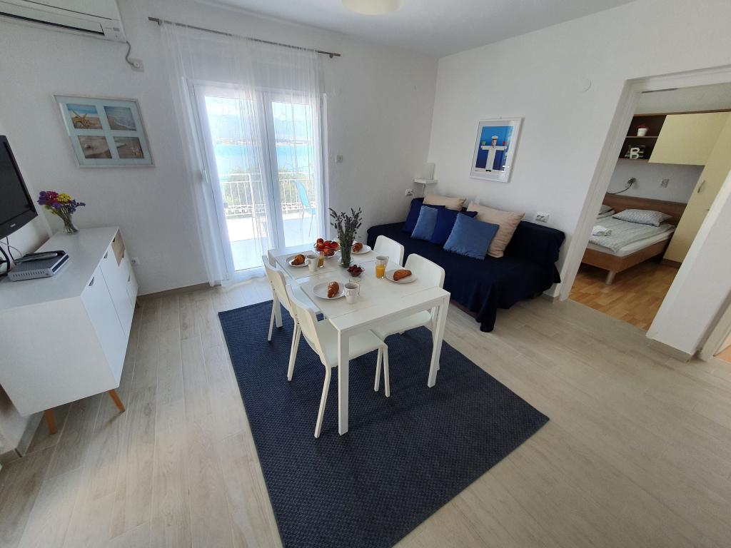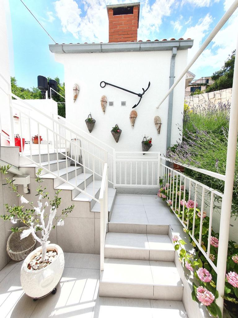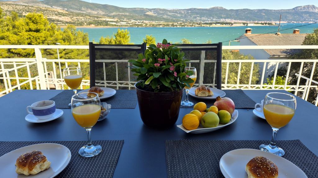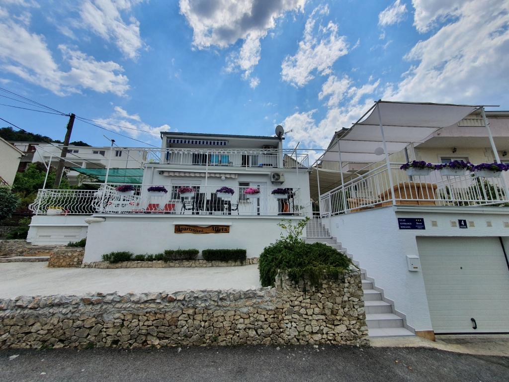 Apartamenty MIRTA znajdują się w północnej części wyspy Čiovo, 1,8 km na wschód od mostu łączącego stare miasto Trogir z Čiovo. Położone są w zacisznym miejscu, niedaleko lasu sosnowego i morza. Kamienista plaża znajduje się u podnóża apartamentu. Apartament 1 znajduje się na pierwszym piętrze domu otoczonego zielenią. Składa się z dwóch sypialni, salonu z jadalnią, kuchni i łazienki. Jest wyposażony tak, aby pomieścić 4-6 osób. W sypialniach znajduje się podwójne łóżko, a w salonie dodatkowe łóżko dla dwóch osób. Apartament 2 znajduje się na parterze. Składa się z dwóch sypialni (łóżka małżeńskie), salonu z jadalnią i kuchnią oraz łazienki. Apartamenty posiadają własny parking, osobne wejście i grill gazowy. Obydwa apartamenty posiadają taras z pięknym widokiem na morze i meblami ogrodowymi. Tarasy są idealne do całodziennego wypoczynku i spotkań towarzyskich na świeżym powietrzu.