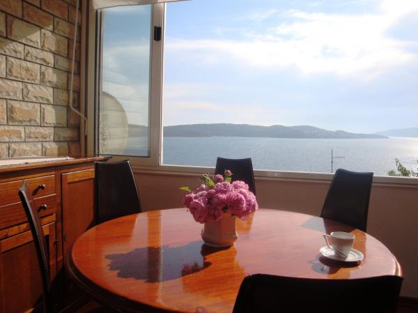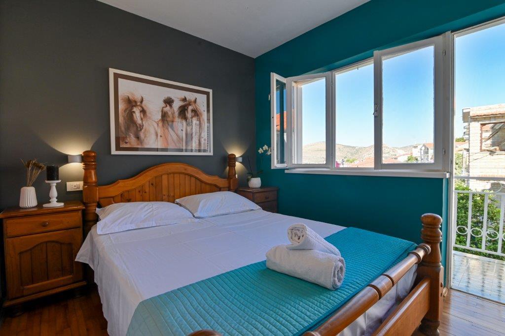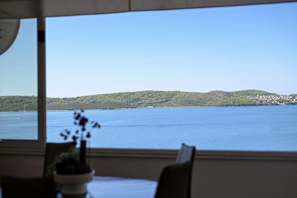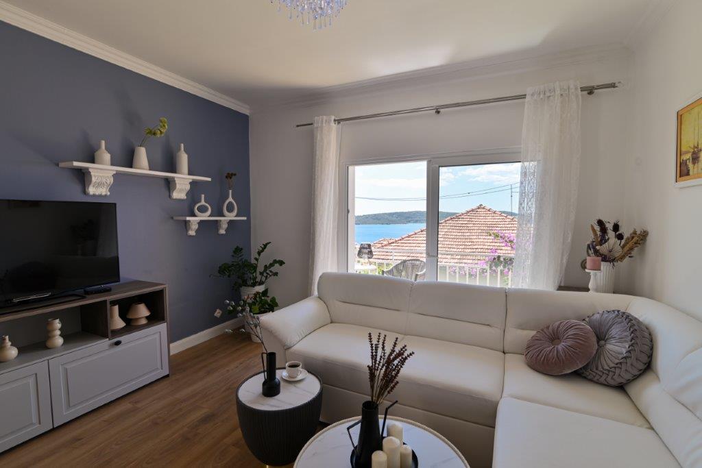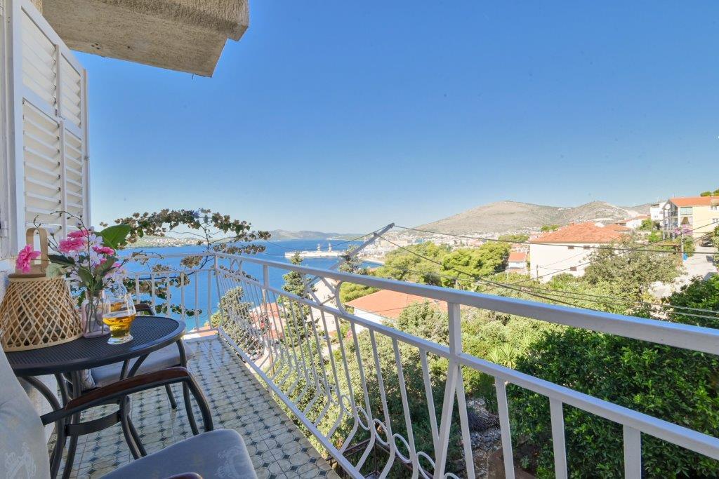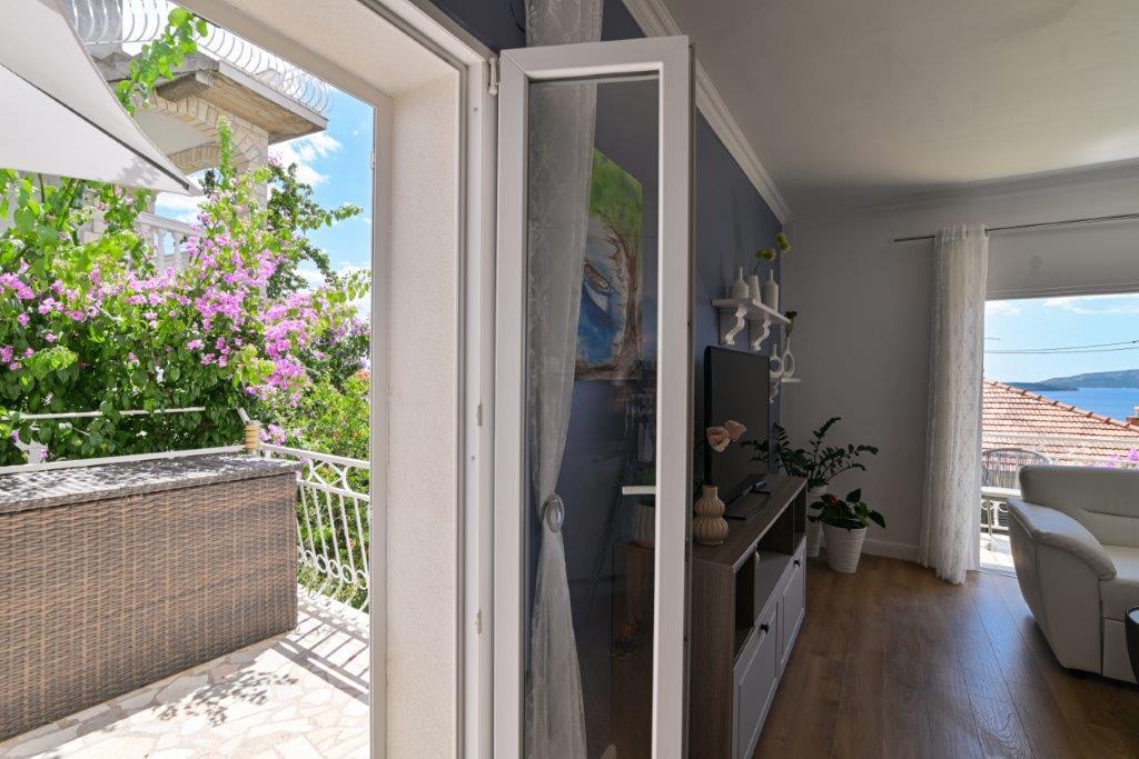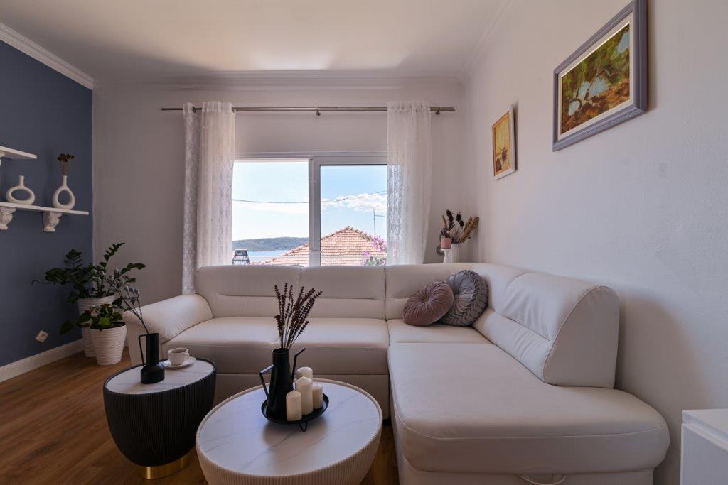 Jest to dom z tekskluzivna mieszkań. Znajduje się w atrakcyjnej części miasta. W południowej części wyspy Ciovo (połączone mostem na brzeg i pięknego miasta Trogir (UNESCO)). Dom położony jest w dzielnicy Mirnyi, z dala od morza (plaża z sosny), niektóre 200m z atrakcyjnej plaży miejskiej w Okrug Gornji około 700m. Odległość od restauracji i sklepów zostało zakończone 150m, szpital, poczta, a wszystkie obiekty są położone w centrum miasta, które znajduje się około 15 minut. chodzenia i około 5 km od lotniska Split (oferowane transport z lotniska po wcześniejszym uzgodnieniu z właścicielami). Dom ma dwa mieszkania. Każdy z nich jest w pełni wyposażone i mają wspaniały widok na morze. Jednym z nich jest podzielone na 4 gwiazdki. Znajduje się na parterze posiada taras i dwa balkony. 2 sypialnie, pokój dzienny z rozkładaną sofą, jadalnią i kuchnią i 2 łazienkami. Wyposażona w pełni (klimatyzacja, Wi-Fi, telewizja satelitarna, pralka, wszystkie urządzenia kuchenne, parking ... a. Drugi znajduje się w kategorii 3 gwiazdki. On jest pierwszym