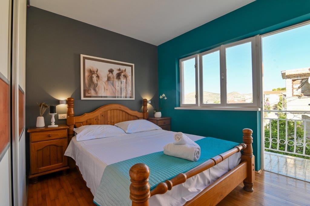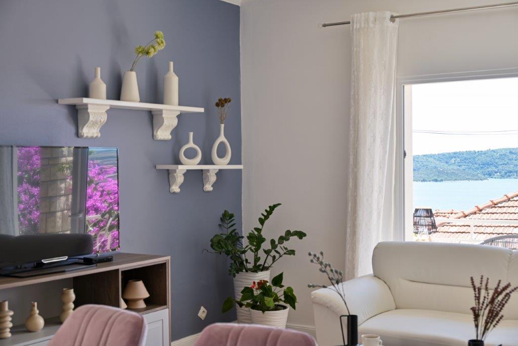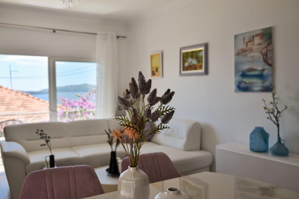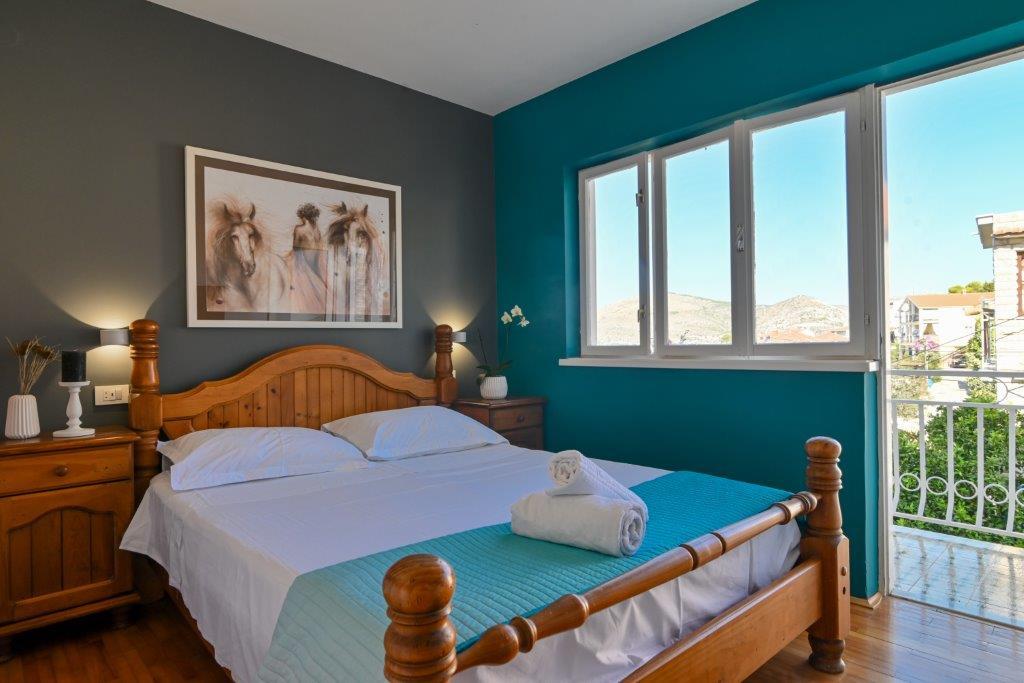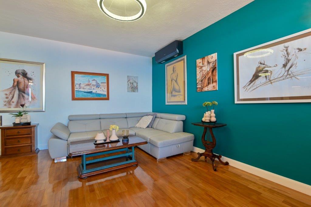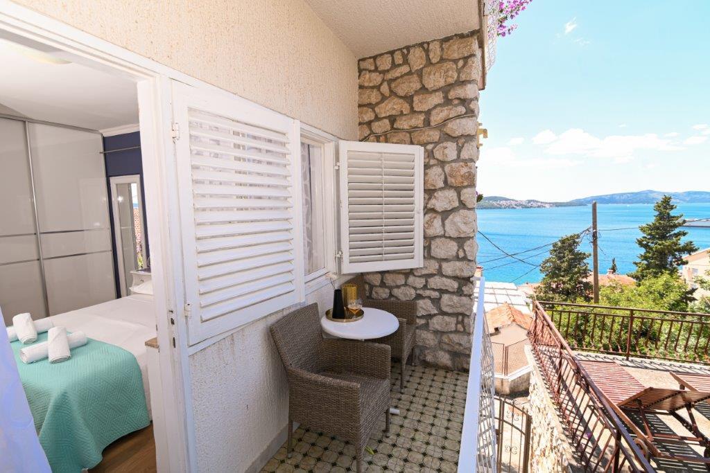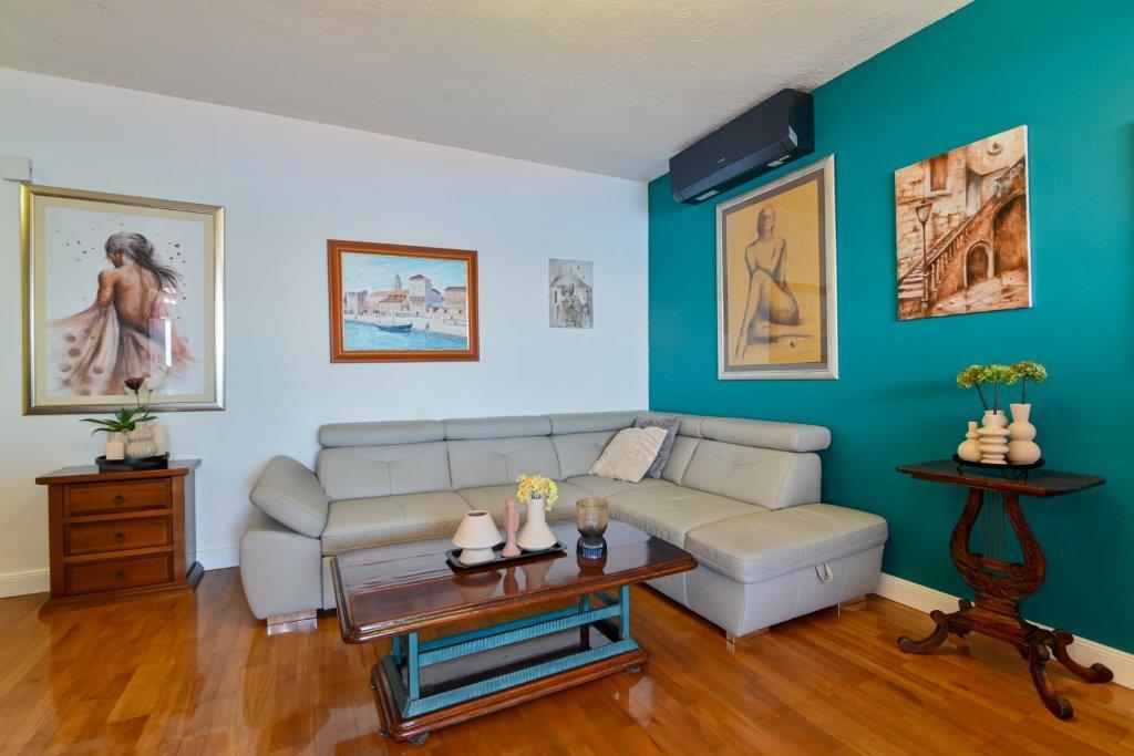 Jest to dom z tekskluzivna mieszkań. Znajduje się w atrakcyjnej części miasta. W południowej części wyspy Ciovo (połączone mostem na brzeg i pięknego miasta Trogir (UNESCO)). Dom położony jest w dzielnicy Mirnyi, z dala od morza (plaża z sosny), niektóre 200m z atrakcyjnej plaży miejskiej w Okrug Gornji około 700m. Odległość od restauracji i sklepów zostało zakończone 150m, szpital, poczta, a wszystkie obiekty są położone w centrum miasta, które znajduje się około 15 minut. chodzenia i około 5 km od lotniska Split (oferowane transport z lotniska po wcześniejszym uzgodnieniu z właścicielami). Dom ma dwa mieszkania. Każdy z nich jest w pełni wyposażone i mają wspaniały widok na morze. Jednym z nich jest podzielone na 4 gwiazdki. Znajduje się na parterze posiada taras i dwa balkony. 2 sypialnie, pokój dzienny z rozkładaną sofą, jadalnią i kuchnią i 2 łazienkami. Wyposażona w pełni (klimatyzacja, Wi-Fi, telewizja satelitarna, pralka, wszystkie urządzenia kuchenne, parking ... a. Drugi znajduje się w kategorii 3 gwiazdki. On jest pierwszym