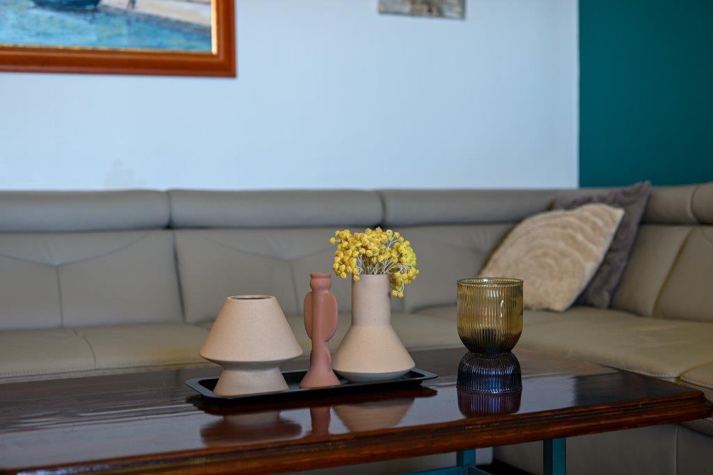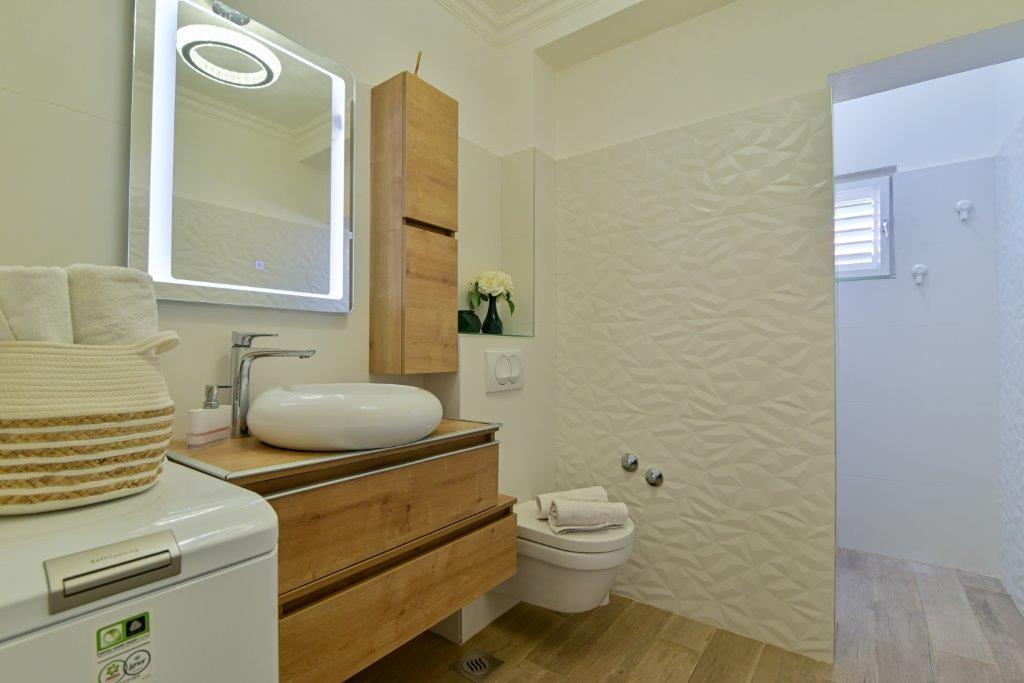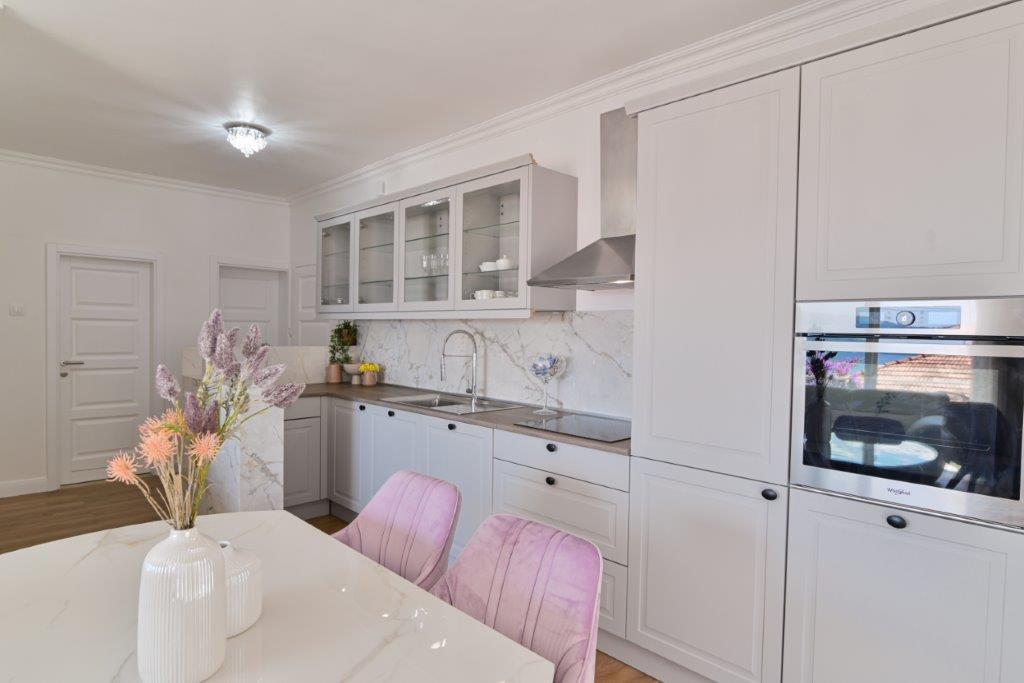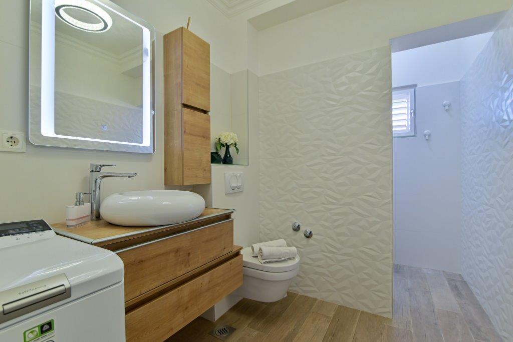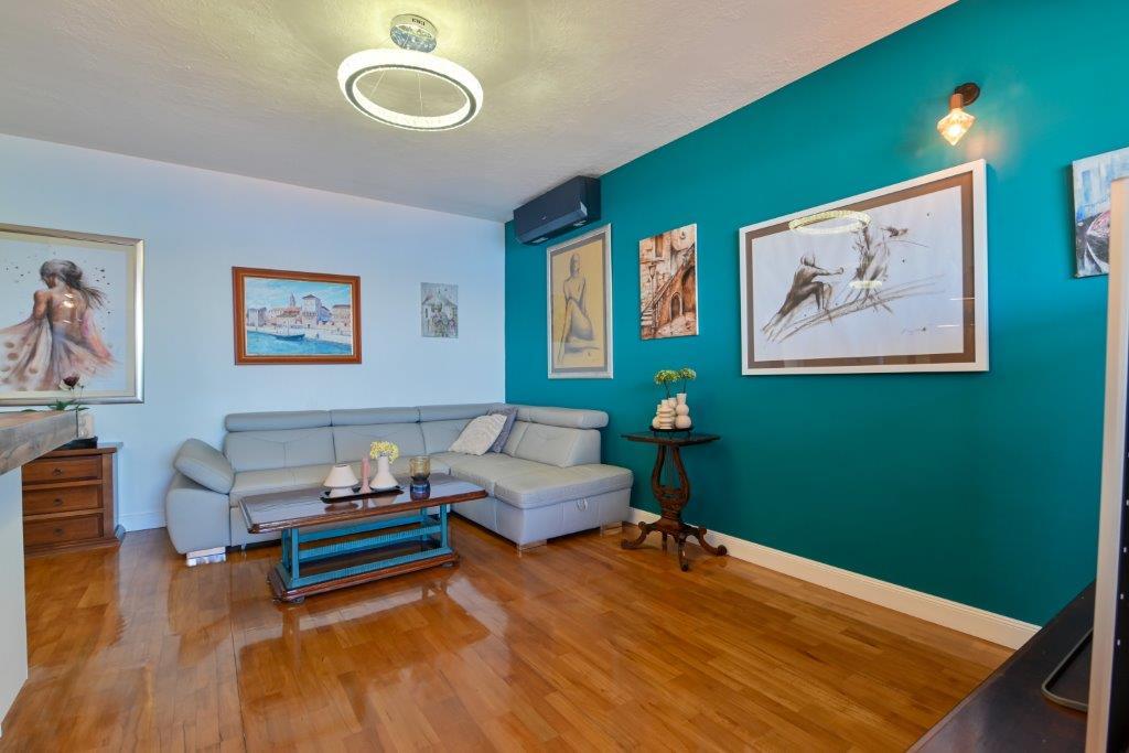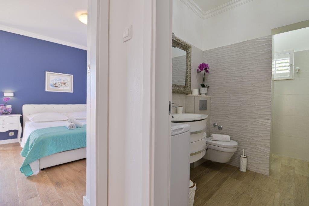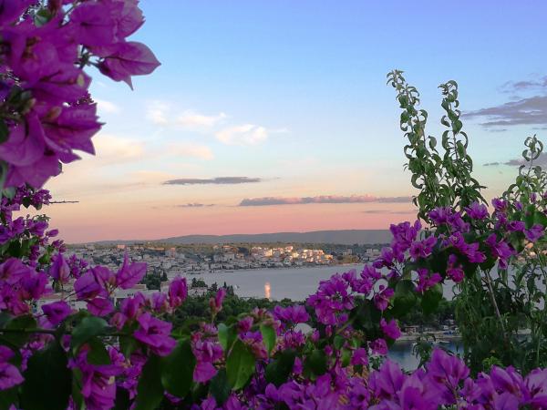 Jest to dom z tekskluzivna mieszkań. Znajduje się w atrakcyjnej części miasta. W południowej części wyspy Ciovo (połączone mostem na brzeg i pięknego miasta Trogir (UNESCO)). Dom położony jest w dzielnicy Mirnyi, z dala od morza (plaża z sosny), niektóre 200m z atrakcyjnej plaży miejskiej w Okrug Gornji około 700m. Odległość od restauracji i sklepów zostało zakończone 150m, szpital, poczta, a wszystkie obiekty są położone w centrum miasta, które znajduje się około 15 minut. chodzenia i około 5 km od lotniska Split (oferowane transport z lotniska po wcześniejszym uzgodnieniu z właścicielami). Dom ma dwa mieszkania. Każdy z nich jest w pełni wyposażone i mają wspaniały widok na morze. Jednym z nich jest podzielone na 4 gwiazdki. Znajduje się na parterze posiada taras i dwa balkony. 2 sypialnie, pokój dzienny z rozkładaną sofą, jadalnią i kuchnią i 2 łazienkami. Wyposażona w pełni (klimatyzacja, Wi-Fi, telewizja satelitarna, pralka, wszystkie urządzenia kuchenne, parking ... a. Drugi znajduje się w kategorii 3 gwiazdki. On jest pierwszym