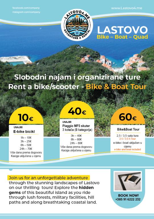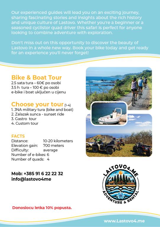 Specjalne ceny na wypożyczenie e-rowerów, samochodów, hulajnóg, quadów oraz zorganizowane wycieczki po wyspie dla użytkowników apartamentów. Szczegółową ofertę treści dodatkowych można zobaczyć na stronie www.lastovo4.me (w budowie)