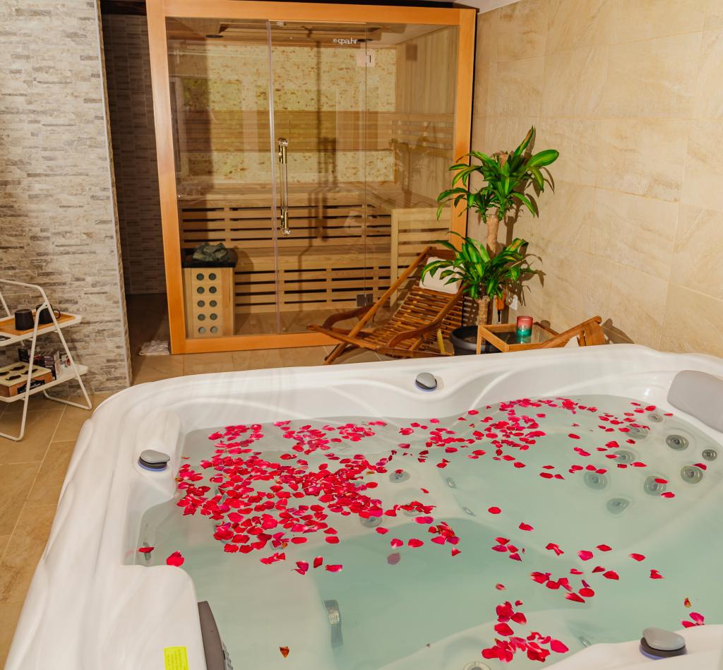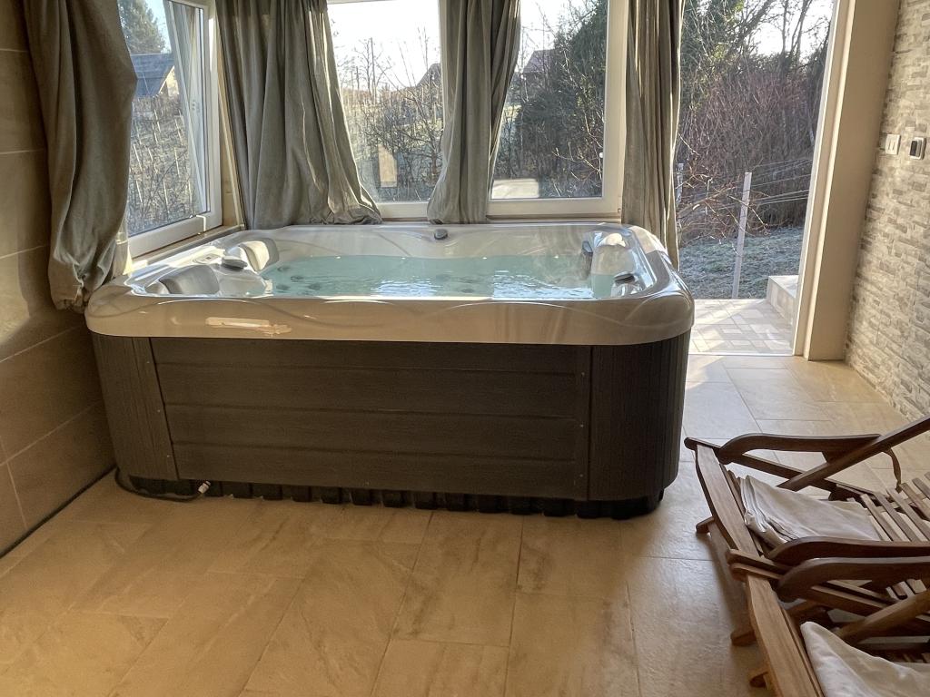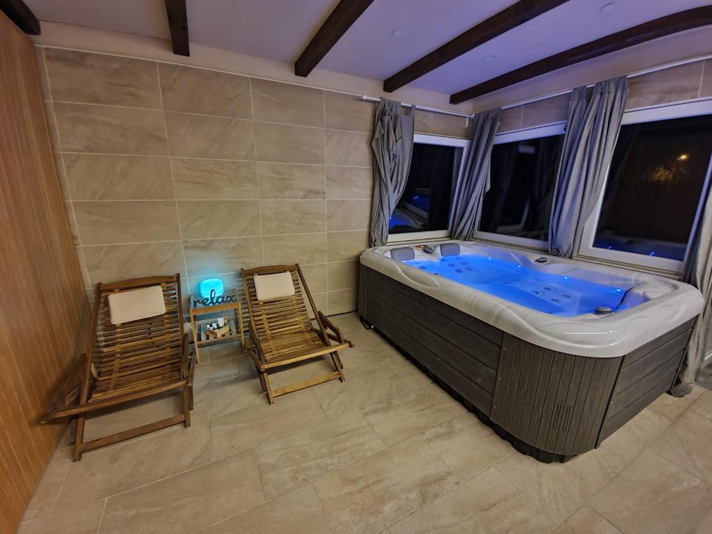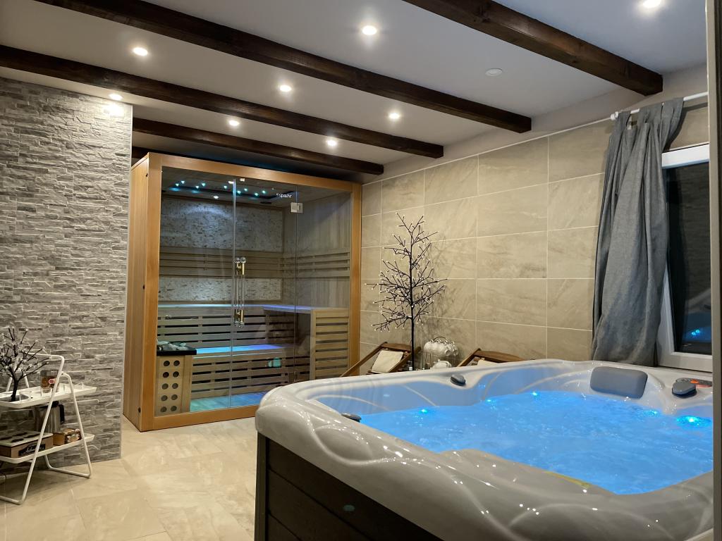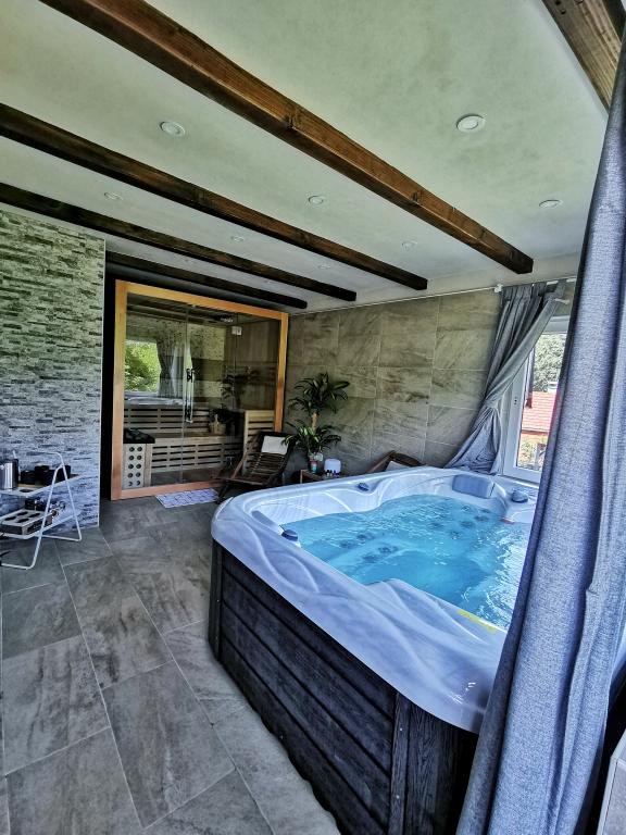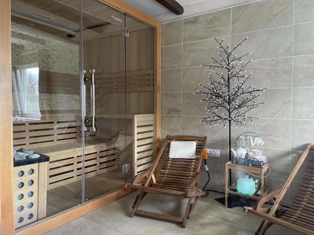 Opłata jest wliczone w cenę.dom wczasowy dom na małe uroczystości centrum spa mini wellness jacuzzi sauna fińska zadaszony taras strefa relaksu relaks leżaki spacery po lesie