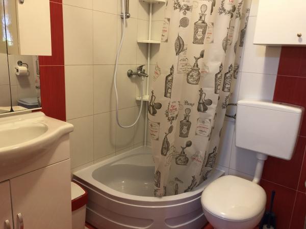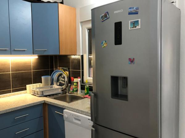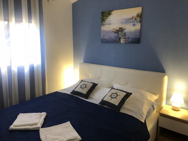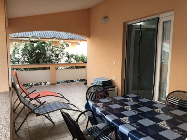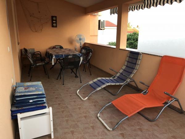Nowocześnie wyposażony apartament 200 m od plaży i położony w pierwszej części wyspy. Mieszkanie (60 m2) znajduje się na pierwszym piętrze i składa się z dwóch sypialni (łóżko małżeńskie i dwa oddzielne łóżka). Przestronny salon z kuchnią, łazienką, telewizorem z płaskim ekranem i internetem WiFi. W kuchni znajduje się zmywarka, mikrofalówka, duża lodówka, czajnik, piekarnik i płyta grzejna. Przestronny taras (15 m2) posiada markizę i jest zadaszony; na tarasie znajdują się leżaki oraz przestronny stół dla 6 osób. W apartamencie istnieje możliwość korzystania ze wspólnego grilla oraz pralki. Woda w mieszkaniu jest zdatna do picia (z wodociągu miejskiego). Parking jest zapewniony w budynku. Palenie dozwolone jest tylko na tarasie.