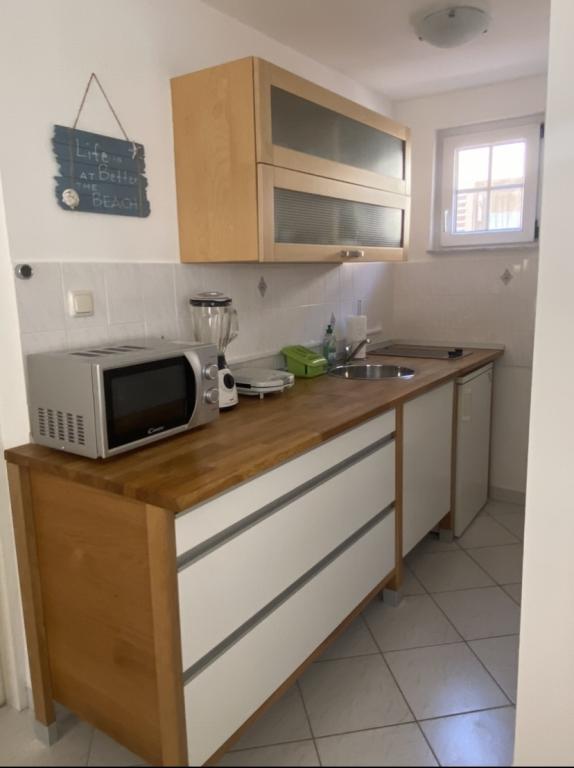 Oferujemy zakwaterowanie w nowo wyremontowanym dwupokojowym apartamencie typu studio na parterze domu o powierzchni 37m2. Składa się z 2 sypialni, wyposażonej kuchni, jadalni, łazienki i dużego tarasu. Dom posiada pięknie zagospodarowany dziedziniec, grill i ogrodzony parking na 1 samochód. Idealny na spokojny i przyjemny wypoczynek. Kawalerka znajduje się przy ślepej uliczce, która nie jest ruchliwa i jest idealna dla dzieci. Do plaży jest 400 m. Na plaży znajduje się kawiarnia. Kawalerka wyposażona jest w: karmnik dla niemowląt, klimatyzację, telewizor LED, czajnik, mikrofalówkę, toster, blender, kuchenkę, lodówkę, suszarkę do włosów, żelazko, suszarkę do bielizny, ogrodowy grill.