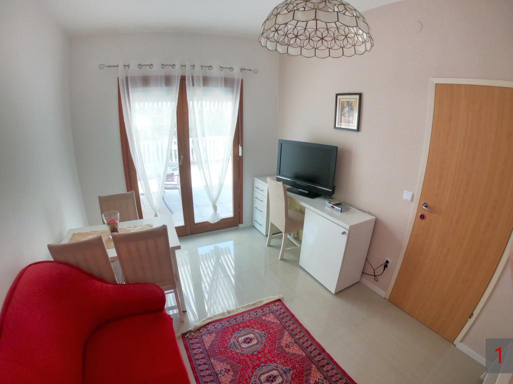 Apartament - 1 - składa się z dwóch osobnych pokoi, osobnej kuchni i łazienki. W jednym pokoju znajduje się podwójne łóżko, w drugim narożnik. Do mieszkania przynależy zadaszony taras o powierzchni 50 m2 otoczony lasem sosnowym. Ogromnym atutem apartamentu jest położenie na końcu ślepej, cichej i wyłączonej z ruchu ulicznego, co daje gwarancję spokoju i prywatności. Na terenie budynku znajduje się miejsce parkingowe oraz grill do grillowania.