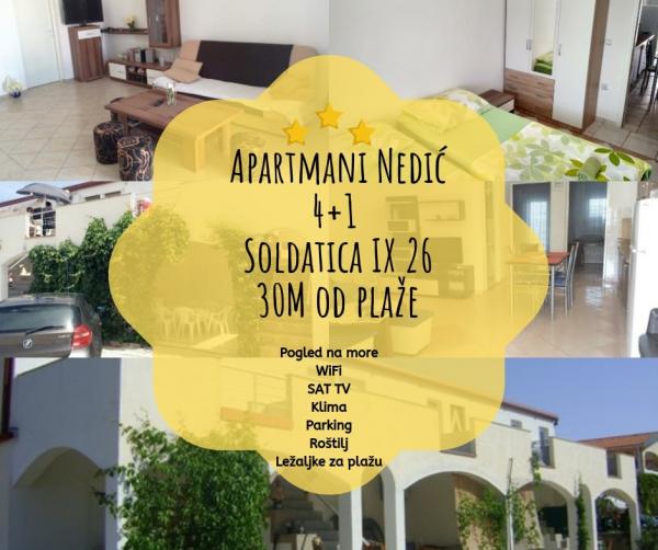Przestronne iw pełni wyposażone apartamenty w cichej, wschodniej części wyspy Vir, zaledwie 30 metrów od kamienistej plaży. Każdy z 3 apartamentów ma 70 metrów kwadratowych i może pomieścić do 5 osób. Apartamenty posiadają dwie sypialnie, duży salon, w pełni wyposażoną kuchnię i tarasy z widokiem na morze. Idealny wybór dla rodzin z dziećmi lub młodszych par. Na podwórku znajduje się również grill, a każdy apartament ma własne miejsce parkingowe.