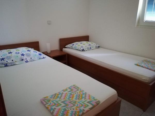 Nowoczesne, w pełni umeblowane apartamenty z dwiema sypialniami dla 4 osób z kuchnią, jadalnią, wspólnym tarasem i grillem na podwórku, jedno miejsce parkingowe na apartament. Podwórko jest ogrodzone i zamykane na noc. Odległość do plaży 200 m, do sklepu 50 m, a do supermarketu 500 m.