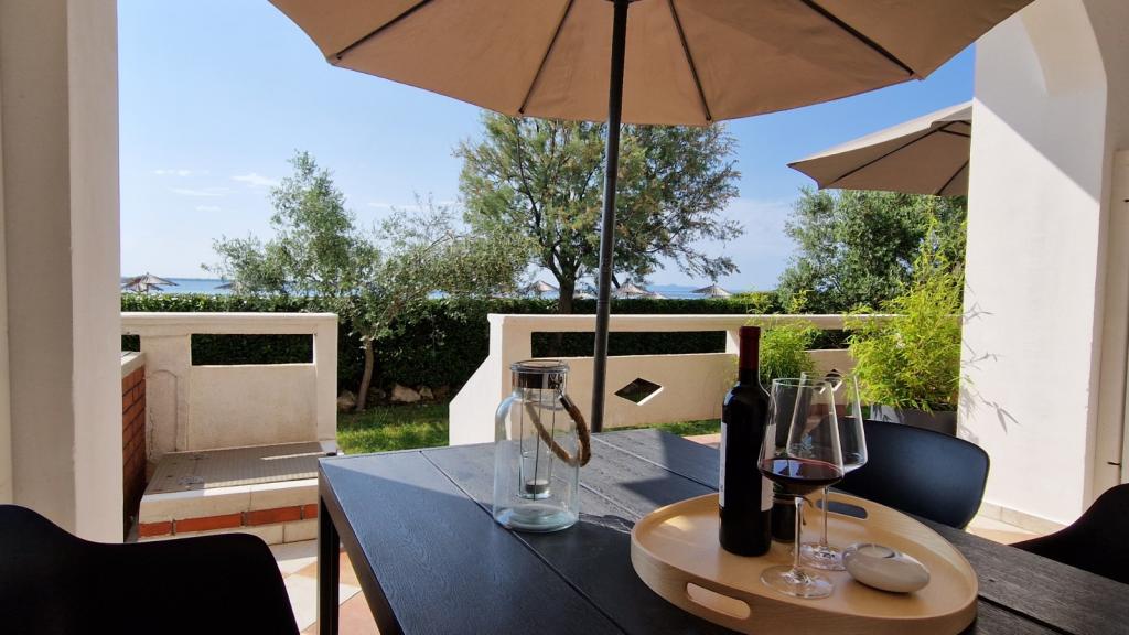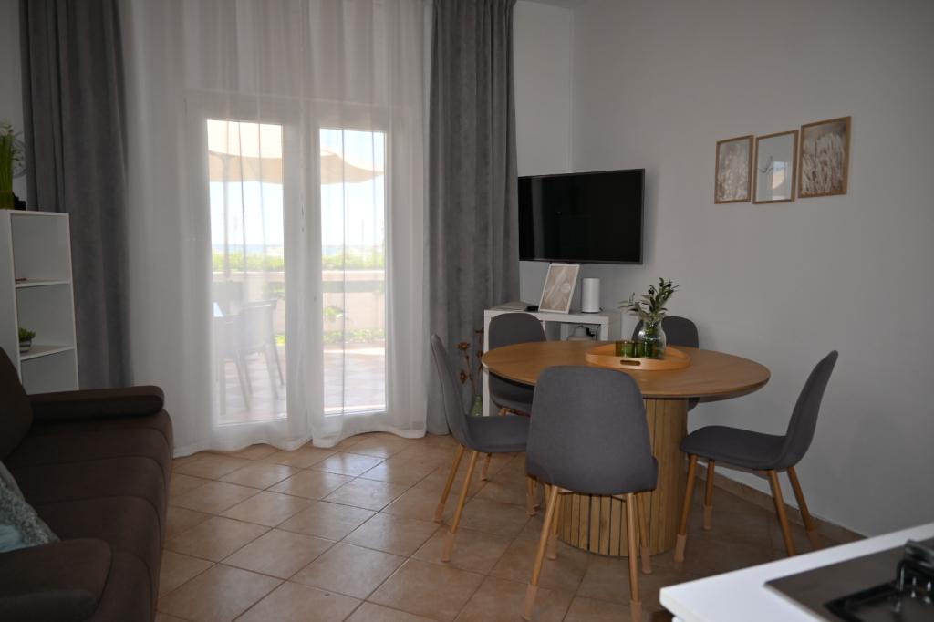 Nasze apartamenty znajdują się w pierwszym rzędzie od morza i są w pełni wyposażone. Każdy apartament posiada osobne wejście i taras z widokiem na morze. Ze względu na bliskość morza, apartamenty te są idealne dla rodzin z małymi dziećmi. Plaża jest płytka i piaszczysta. Wszyscy nasi goście mają do dyspozycji 1 bezpłatne miejsce parkingowe na naszym podwórku.