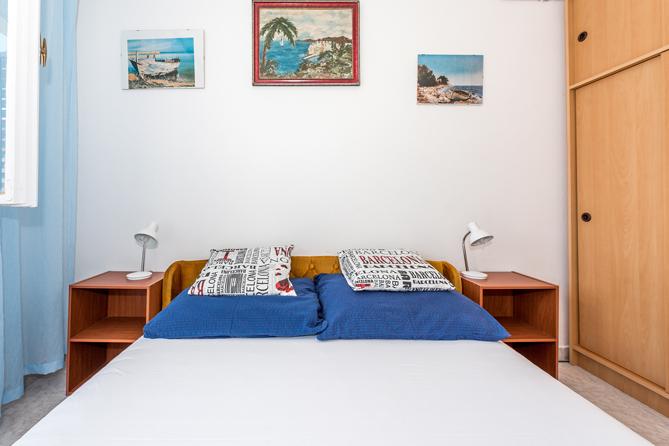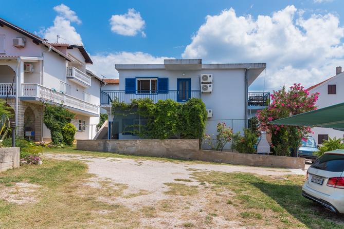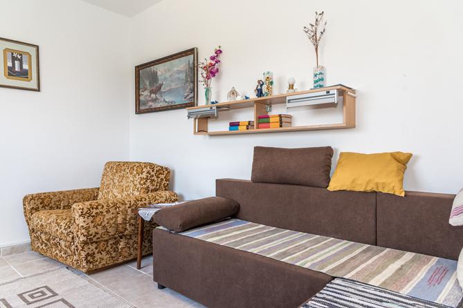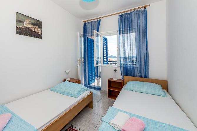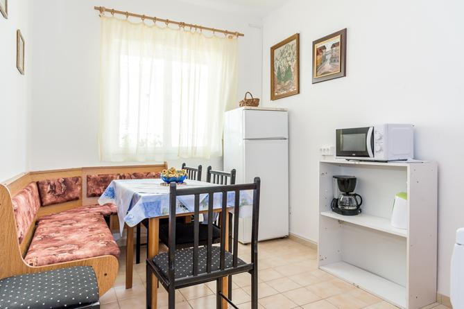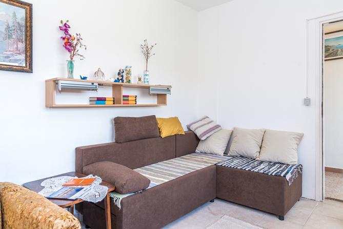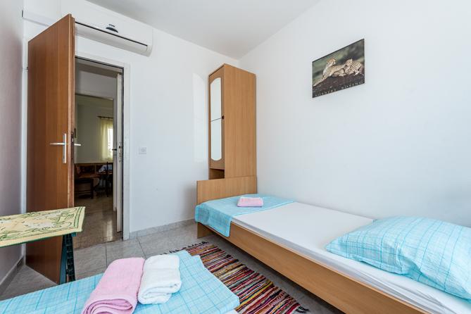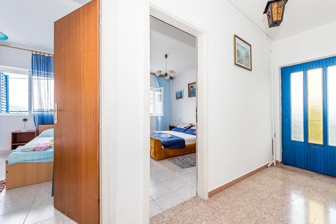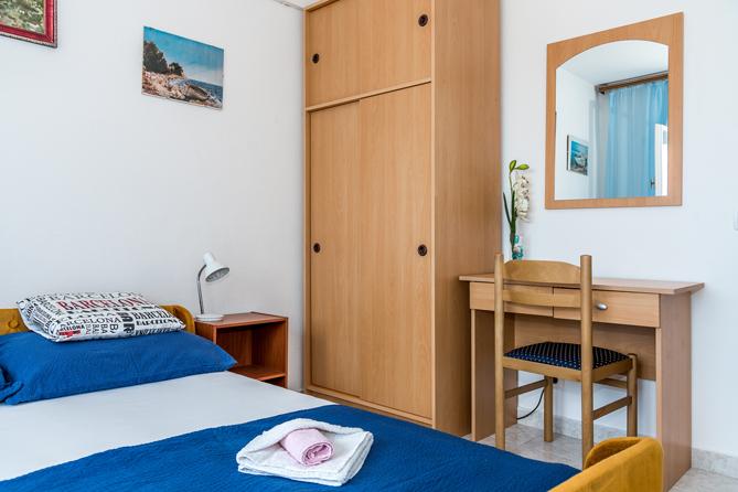 W pełni wyposażony apartament składający się z dwóch oddzielnych sypialni, jedna z łóżkiem podwójnym i druga z dwoma pojedynczymi łóżkami, oba pokoje posiadają własną klimatyzację. Łazienki z toaletami, salony z telewizorami, kuchnie z nowymi lodówkami. Tarasy z widokiem na morze. Mieszkanie znajduje się na 1 piętrze domu rodzinnego. Dostępny jest parking.