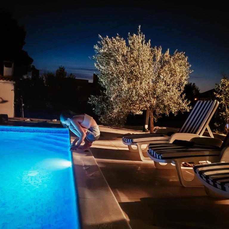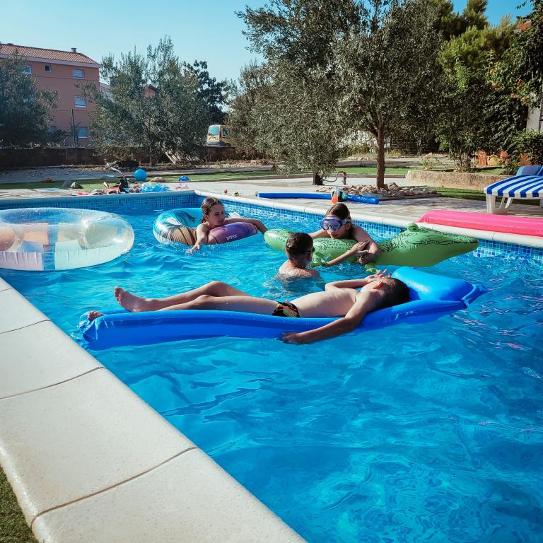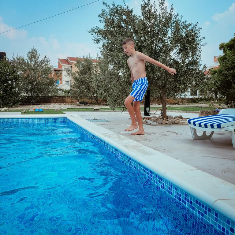 Nowo wyremontowane duże apartamenty z zewnętrznym BASENEM TYLKO DLA CIEBIE!! JAK DOM WAKACYJNY!! Całkowicie NOWO WYREMONTOWANA kuchnia z nowymi urządzeniami (lodówka, zamrażarka, piekarnik, płyta grzewcza, kuchenka mikrofalowa, czajnik, zmywarka, pralka, okap). Naczynia i przybory kuchenne. Salon z narożną sofą, którą w razie potrzeby można rozłożyć na przestronne łóżko. Nowy telewizor z kanałami satelitarnymi. Sypialnie z przestronnymi łóżkami podwójnymi. Pościel. Wszystkie pokoje są klimatyzowane. Dwie łazienki z toaletą i kabinami prysznicowymi, nowo wyremontowane. Pralka, sprzęt do prasowania, suszarka do włosów. Odkurzacz i środki czyszczące, papier toaletowy, mydło, ręczniki. Do dyspozycji Gości jest również taras o powierzchni 30 m2 z meblami ogrodowymi, a także grill, leżaki przy basenie. Ogromny ogród o powierzchni 1300 m2 z mnóstwem śródziemnomorskich drzew. Parking na podwórku BEZPŁATNY!!. Lotniska w Zadarze i Splicie oddalone są o około 60 km. Blisko parków narodowych Krka i Kornati