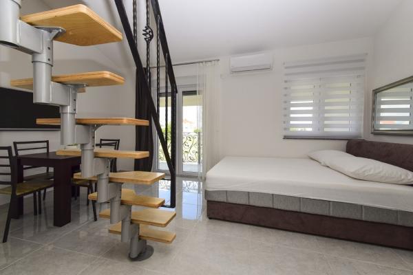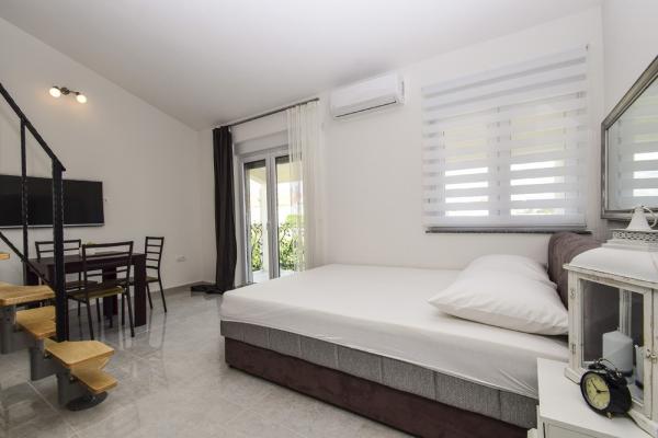 Piękne klimatyzowane apartamenty, nowo wyposażone współczesnych standardów, który spełni i najzahtjenije, higiena samo bez zarzutu. Apartamenty położone są w cichej ulicy, z dużym tarasem i pięknym basenie. Niedaleko plaży, w lesie sosnowym, z dużą ilością do zrobienia dla dzieci i dorosłych, a także hoteli i sklepów. Centrum miasta i jeden z najpiękniejszych przystani na wybrzeżu Adriatyku jest łatwy spacer wzdłuż plaży, 5 minut.