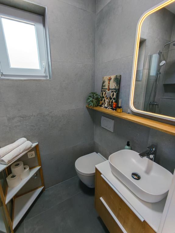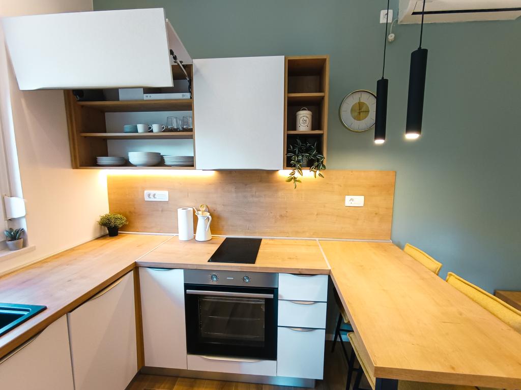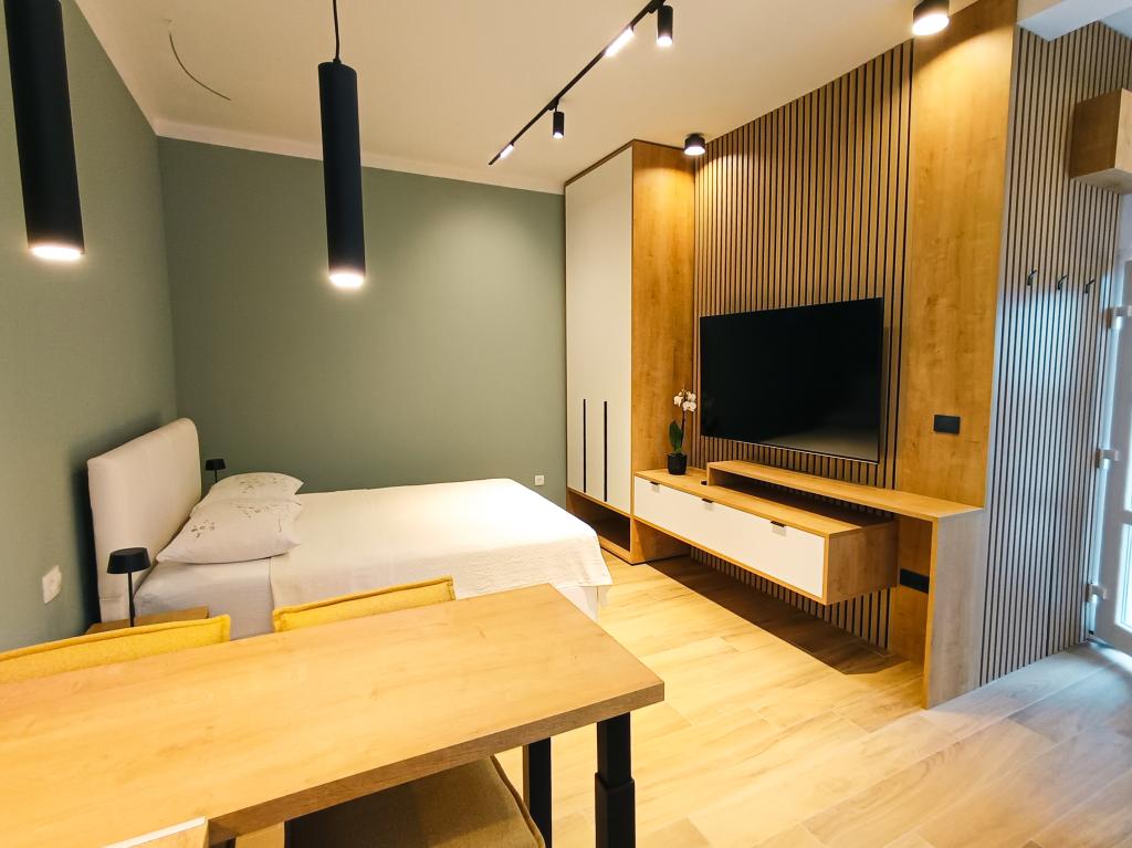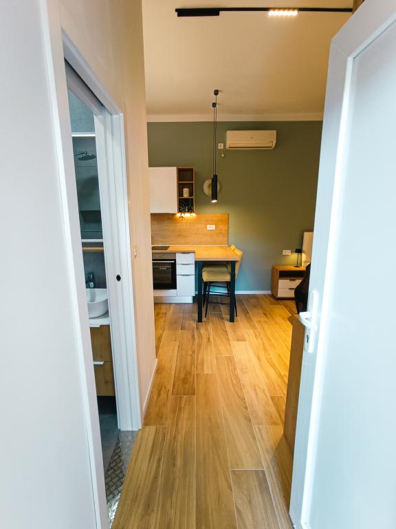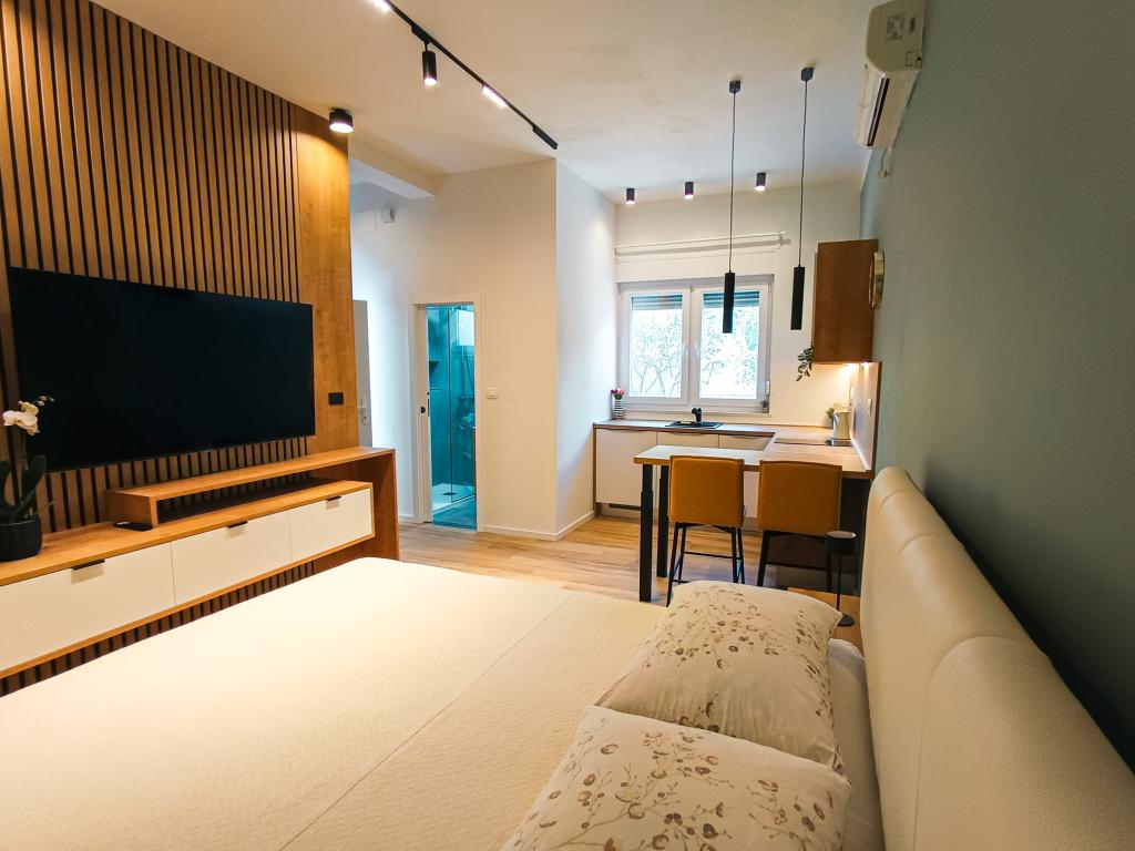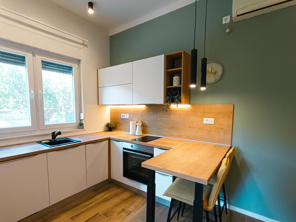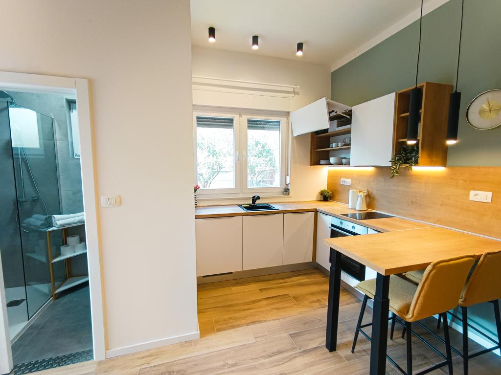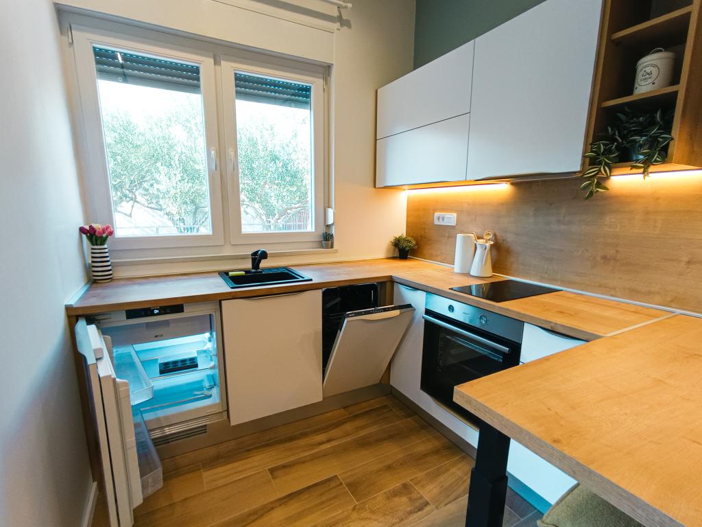 W pełni i nowocześnie wyposażony apartament typu studio w cichej i rodzinnej okolicy. Idealny dla par lub rodziny z jednym dzieckiem. Apartament jest klimatyzowany i posiada wszystkie niezbędne sprzęty AGD i udogodnienia niezbędne do beztroskiego wypoczynku w Zadarze. Wśród urządzeń elektronicznych, na szczególną uwagę zasługują duży telewizor, zmywarka, pralka oraz wbudowana lodówka z zamrażarką. W apartamencie znajdują się wszystkie niezbędne naczynia kuchenne i podstawowe przyprawy. Po wcześniejszym uzgodnieniu możemy wstawić łóżeczko dziecięce, krzesełko do karmienia lub dostawkę. Apartament posiada prywatny parking, a dla miłośników spacerów centrum miasta oddalone jest o około 20 minut spacerem. W pobliżu znajduje się centrum sportu i rekreacji Višnjik, idealne dla osób lubiących aktywność na świeżym powietrzu, z dużym placem zabaw dla dzieci.