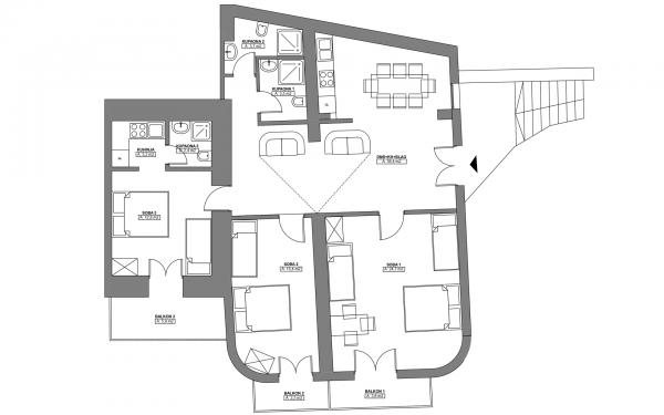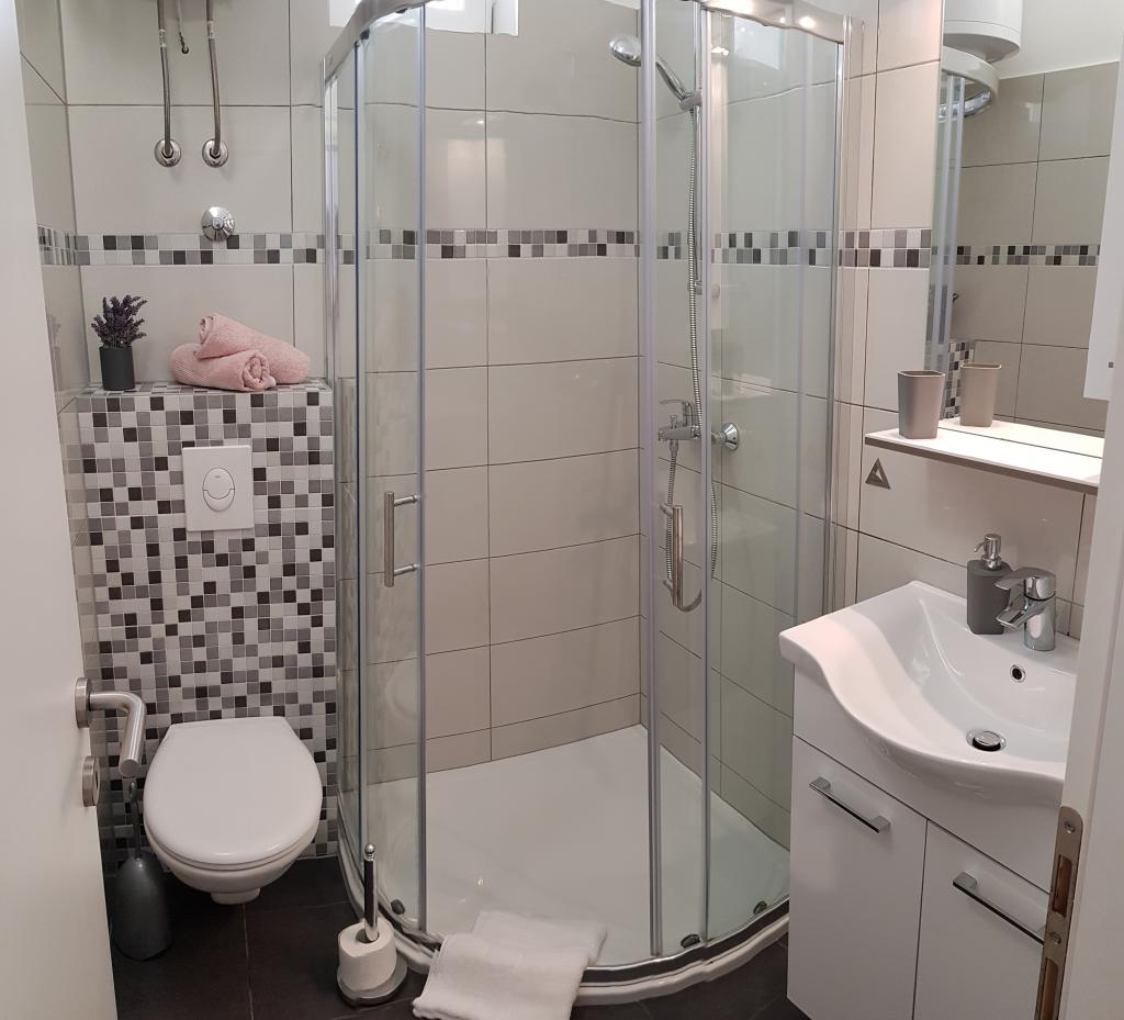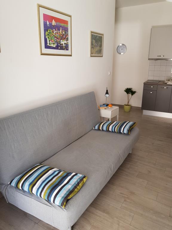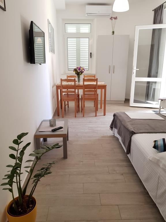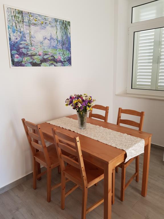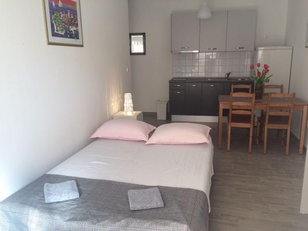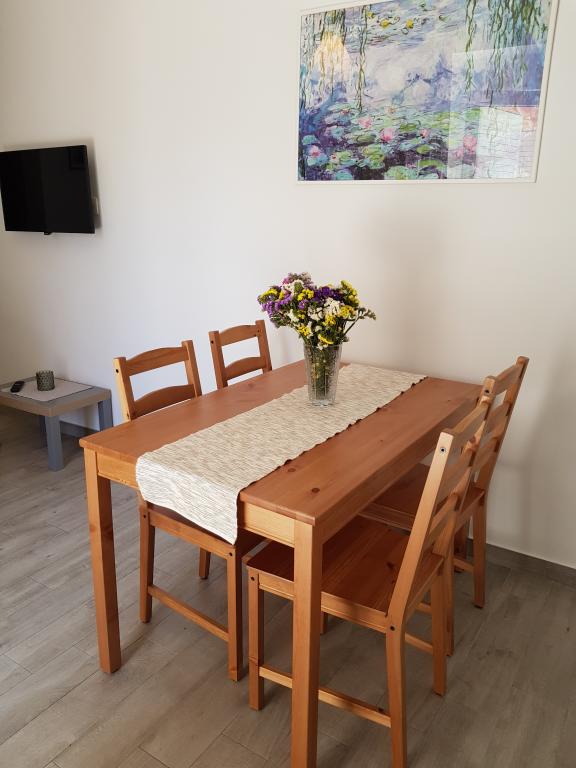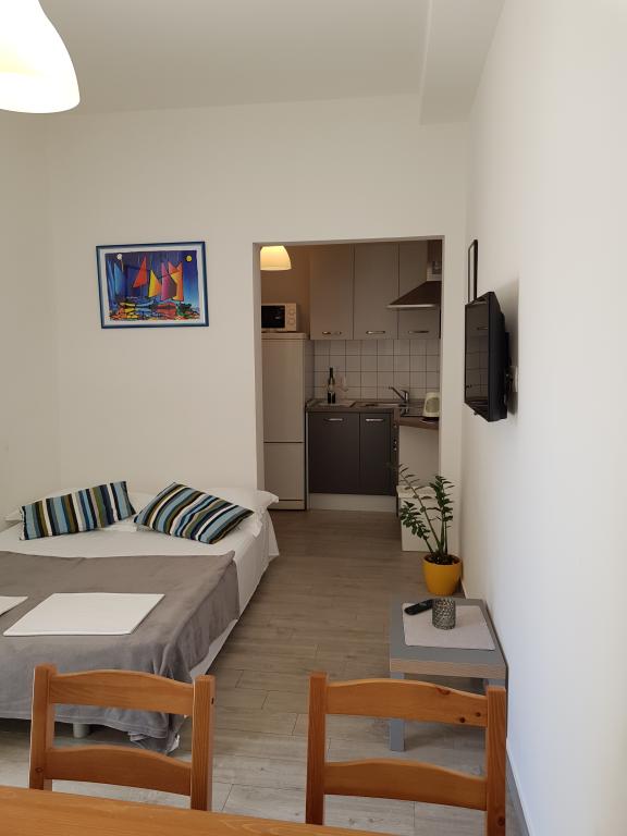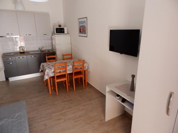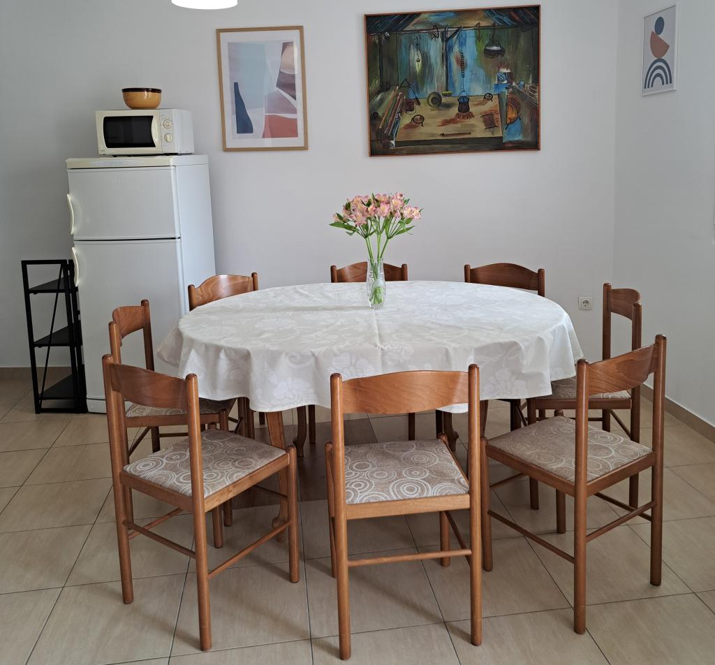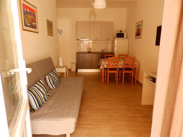 Apartament A2 2 znajduje się na parterze domu jednorodzinnego. Składa się z pokoju z łóżkiem (160x200cm), pokoju dziennego z kanapą (160x200cm), kuchni, łazienki oraz tarasu. Apartament A2 3 znajduje się na parterze domu jednorodzinnego. Składa się z pokoju z łóżkiem (160x200cm) i łóżkiem (90x200cm), pokoju dziennego z kanapą (160x200cm), kuchni, łazienki oraz tarasu. Apartamenty są w pełni przystosowane. Dostęp do tarasu jest łatwy dla wózków dziecięcych i rowerów. (tylko trzy kroki). Ulica jest cicha i tylko dla pieszych. Apartament A-10 1 (A-8 3) znajduje się na pierwszym piętrze. Składa się z jednego pokoju czteroosobowego, dwóch pokoi trzyosobowych, dwóch kuchni, dużego przedpokoju, trzech łazienek, trzech balkonów i tarasu przy wejściu, 40 m od plaży. Wejście jest oddzielone od deptaka. Oba apartamenty posiadają zabezpieczone miejsca parkingowe oraz płaski internet.
