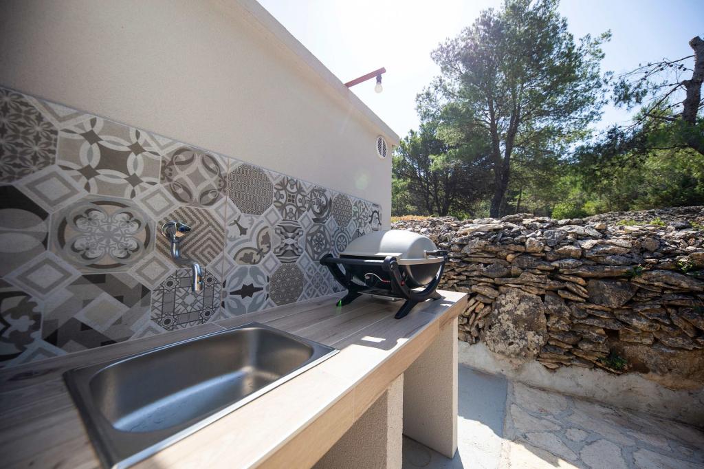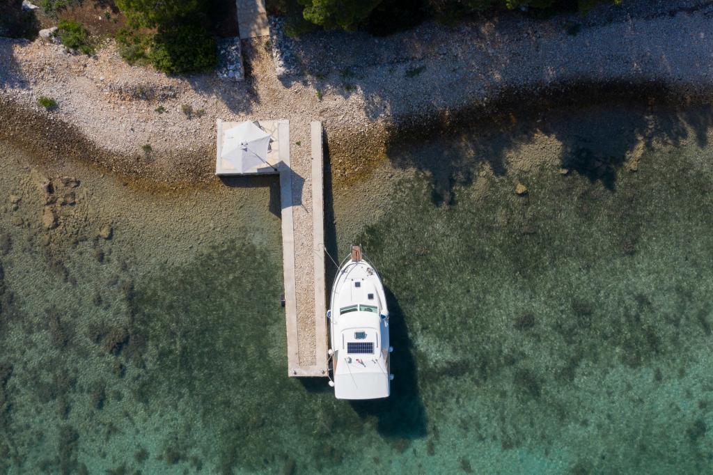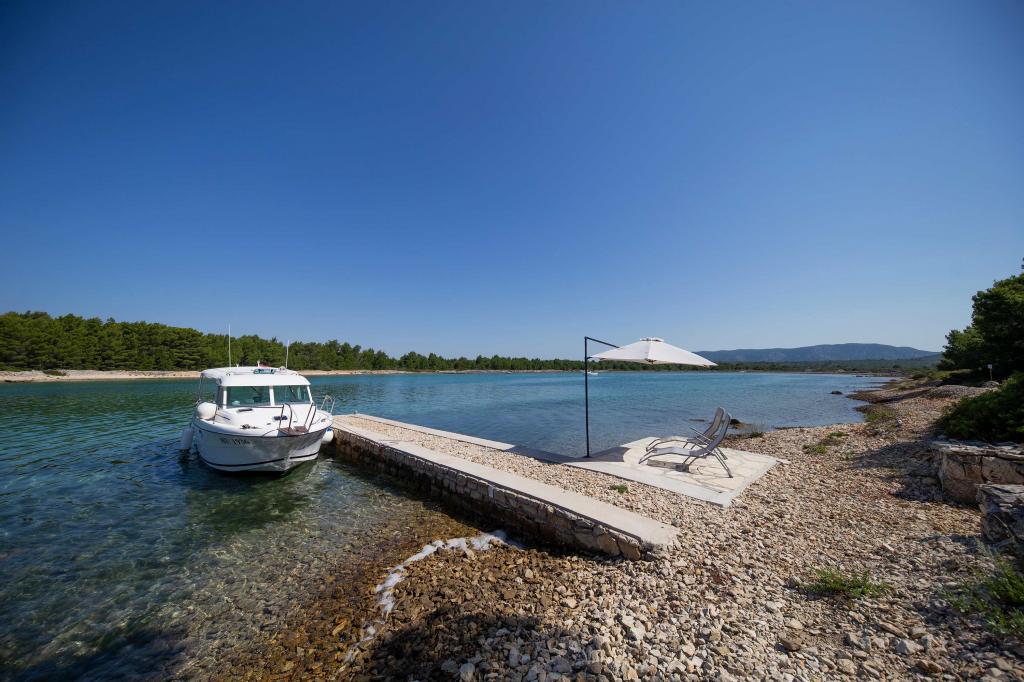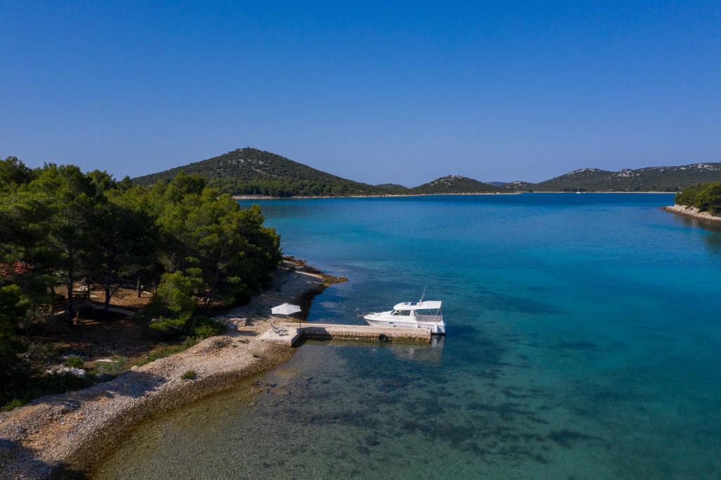 Sea House Modrave znajduje się w zatoce Zečica, 15 minut od Murter. Znajduje się 10 metrów od morza i ma własną przystań. Do obiektu można dotrzeć tylko łodzią. Bezpłatny parking jest dostępny w Murter, podobnie jak transfer do domu. Dom ma jedną sypialnię z podwójnym łóżkiem, łazienkę z prysznicem, rozkładaną sofę, na której mogą spać dwie dodatkowe osoby. Kuchnia ma lodówkę z zamrażarką i kuchenkę gazową. Posiada telewizor z odbiornikiem satelitarnym, internet z połączeniem Wi-Fi i klimatyzację. Dom jest zasilany energią słoneczną i deszczówką, co jest wystarczające, jeśli jest racjonalnie wykorzystywane. Zwierzęta są akceptowane i pobierana jest opłata w wysokości 5 euro za dzień.