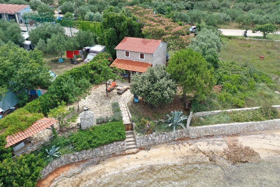 Dom położony jest na południe od centrum miejscowości Tkon na wyspie Pašman, tuż przy drodze. Można wjechać przez bramę i zaparkować samochód tuż obok domu. Obok domu znajduje się kemping dla nudystów, ukryty przed wzrokiem pnączy. Pierwszy budynek po drugiej stronie jest oddalony o 50 metrów. Dom znajduje się 10 metrów od morza i piaszczystej plaży. Głębokość morza wynosi około pół metra, a dno jest piaszczyste, co jest idealne dla dzieci. Przed domem znajduje się zadaszony, drewniany taras ze stołem i ławkami, gdzie można cieszyć się cieniem i zjeść lunch, a tuż obok znajduje się kamienny grill. Przed domem znajduje się również zadaszenie zapewniające cień. Na tarasie znajduje się prysznic na świeżym powietrzu.