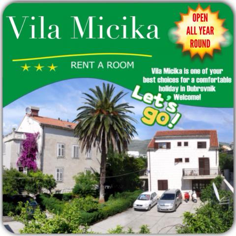 Villa Micika jest najlepszym rozwiązaniem dla komfortowego wypoczynku w Dubrowniku. Otwarte przez cały rok, a podczas świąt Bożego Narodzenia i Wielkiejnocy Villa jest odpowiedni zarówno dla ludzi biznesu, jak i turystów. Willa znajduje się w cichej okolicy Dubrownika, zwanej Lapad, w otoczeniu palm i innych roślin śródziemnomorskich. To jest zaledwie 300 metrów od plaży i 10 metrów od kortów tenisowych. Składa się z 8 pokoi sklasyfikowanych 3 gwiazdki. Pokoje mają pojemność 12-15m2 i ma 8 podwójne łóżka i może pomieścić 16 osób. Budynek stoi sam i znajduje się na dwóch piętrach. Wszystkie pokoje posiadają widok na pięknej, zielonej przestrzeni i wyposażone są w łazienkę, prysznic, WC, TV-SAT, klimatyzacja i wszystkie pomieszczenia centralnego ogrzewania. W budynku znajduje się wspólny taras oraz prywatny parking off-road dla samochodu