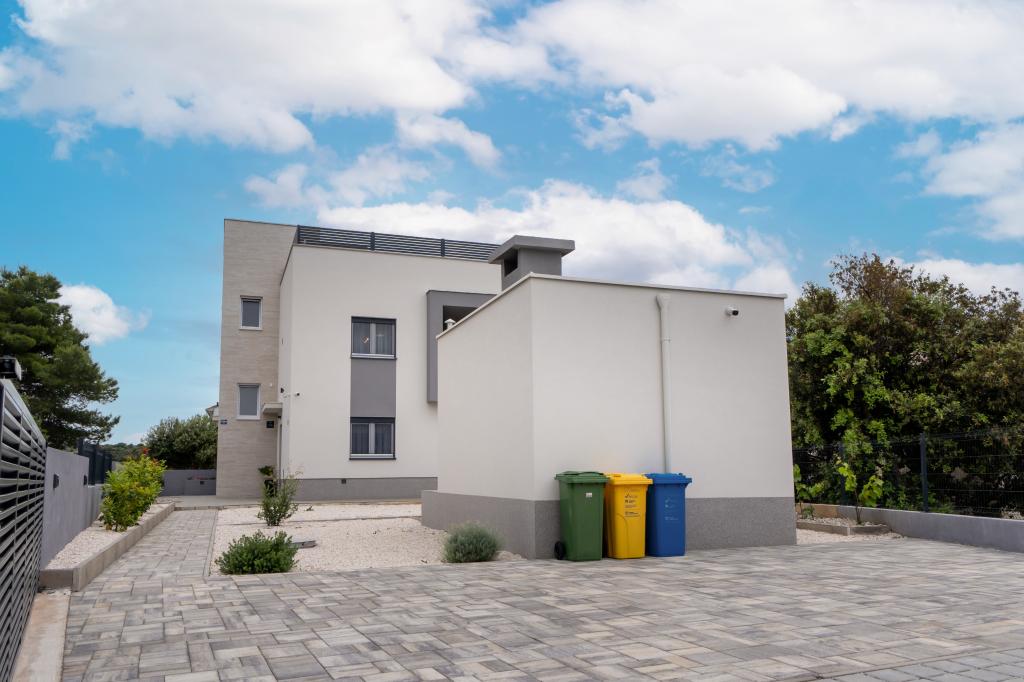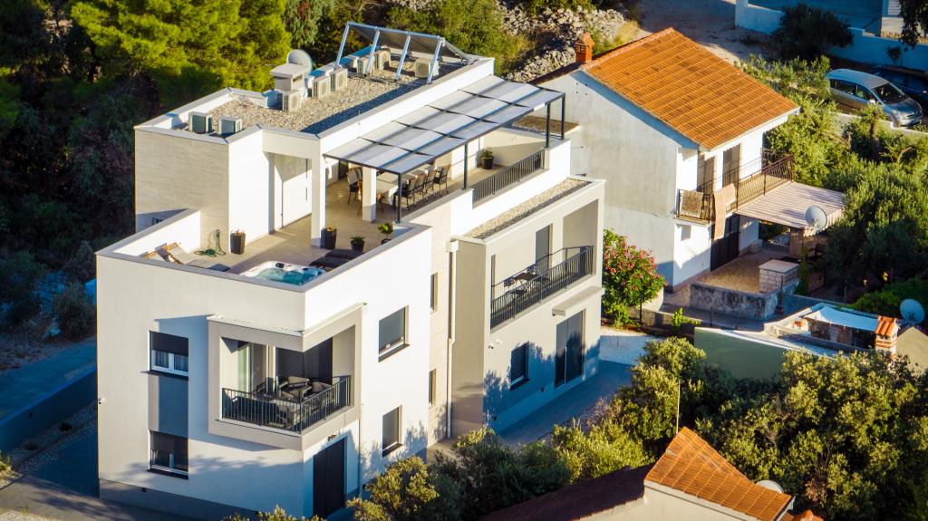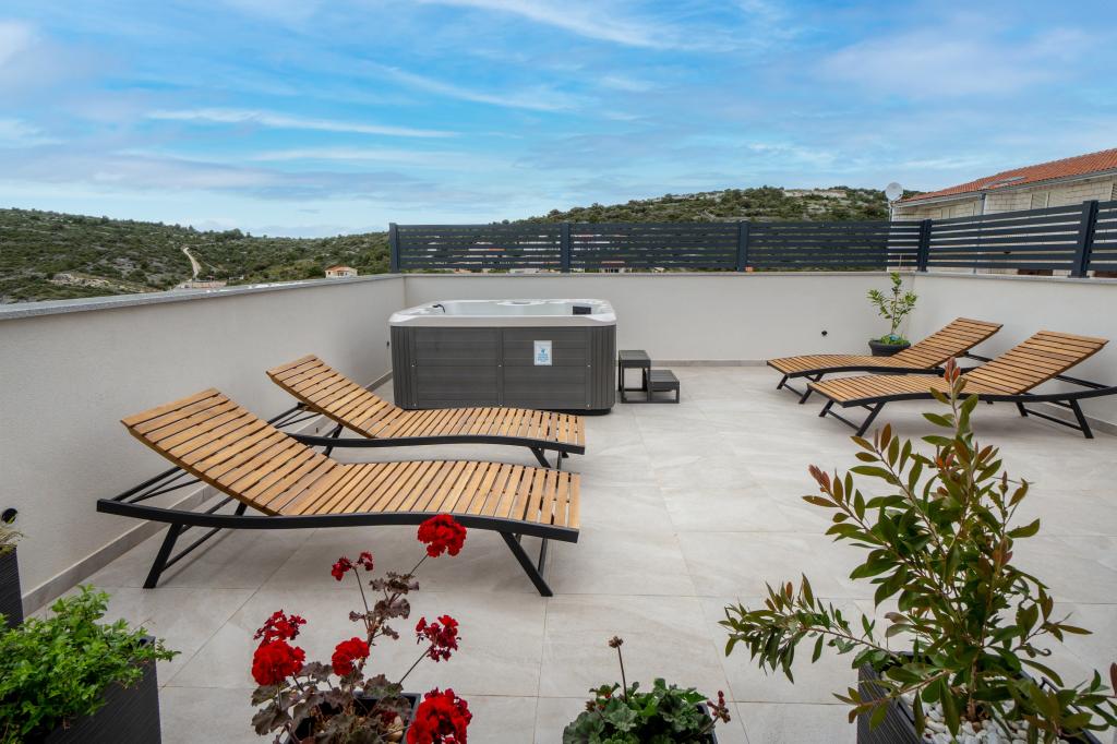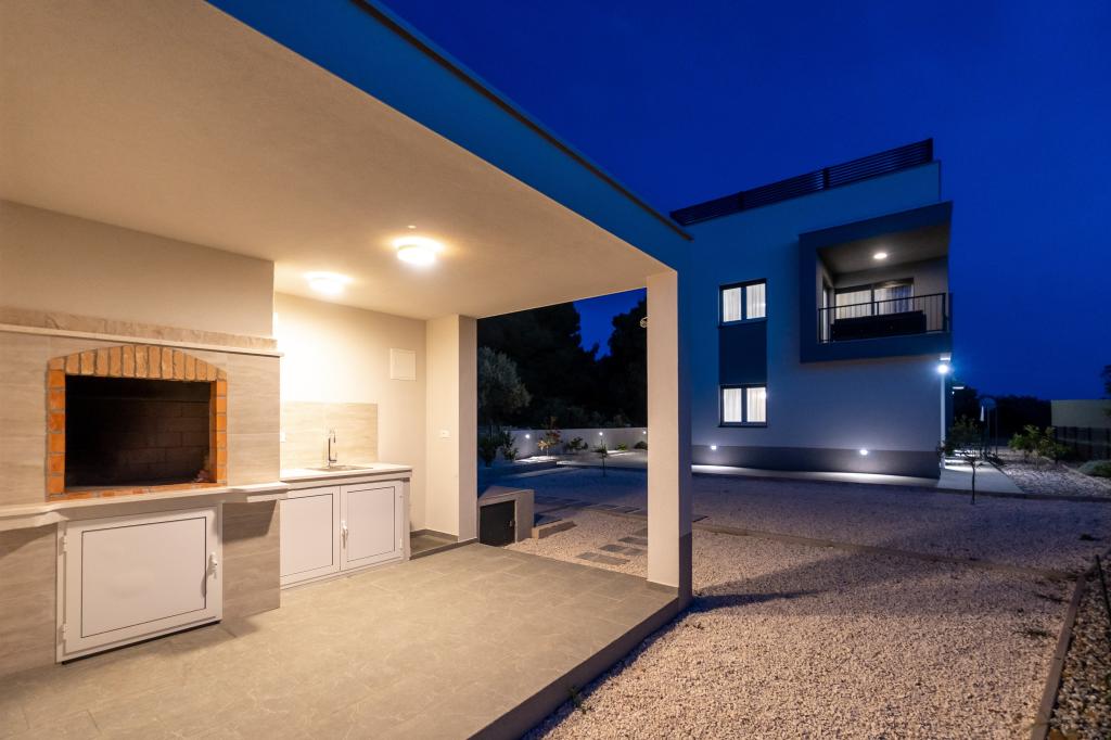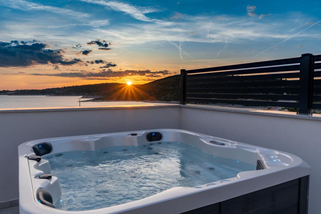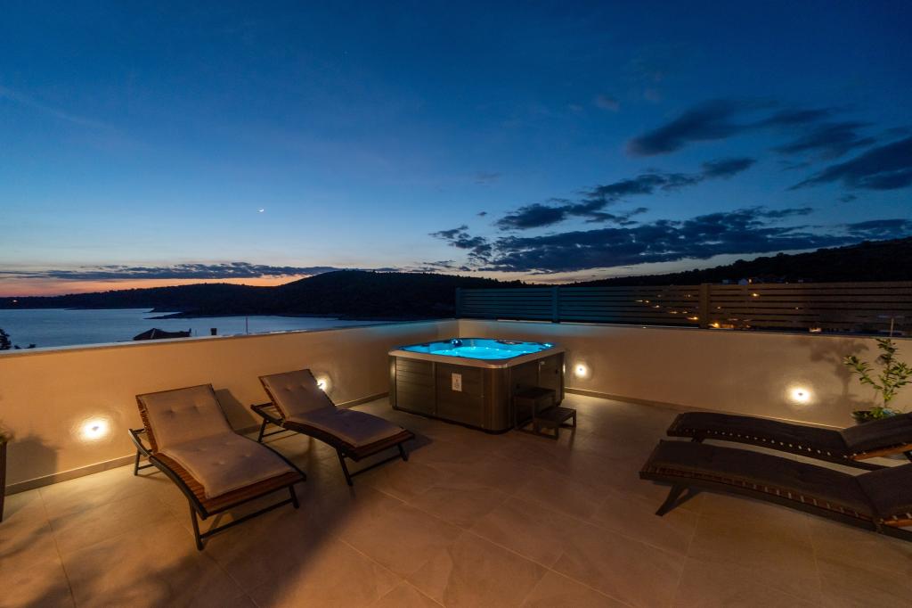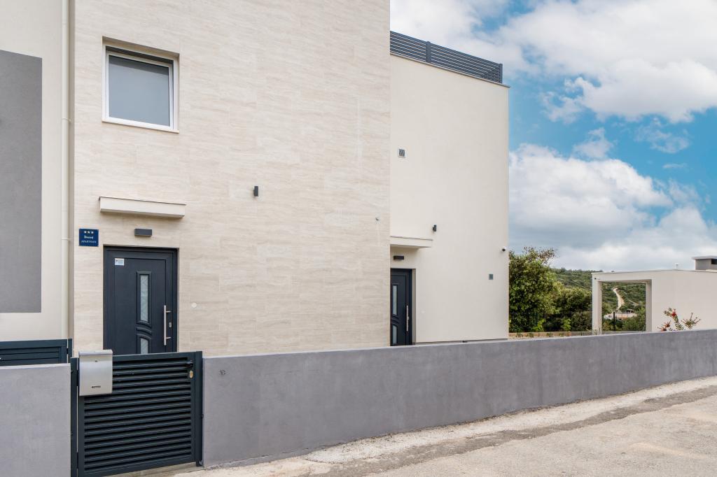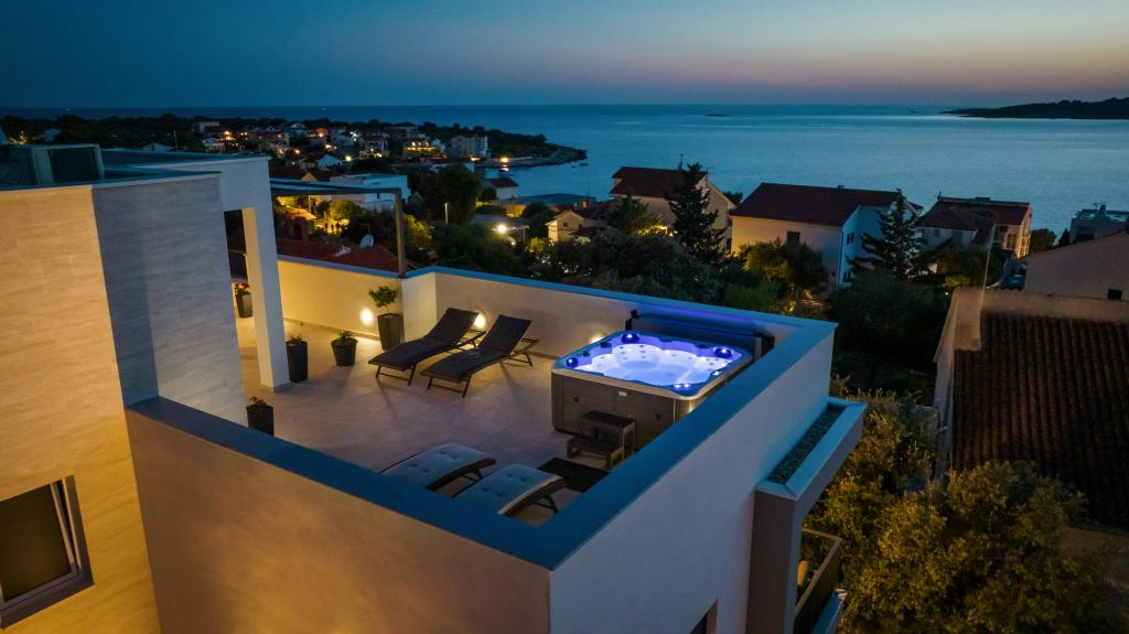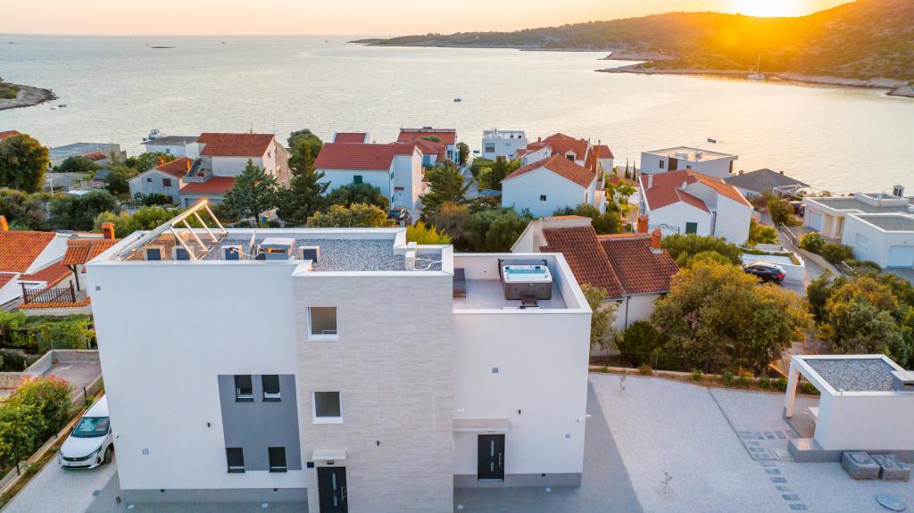 Nowy obiekt. Ciesz się z rodziną w tym nowoczesnym obiekcie z pięknym zachodem słońca i widokiem na morze. Cicha okolica. Dwa apartamenty wynajmowane w całości. Na parterze znajduje się apartament typu studio składający się z kuchni, łazienki i pokoju z łóżkiem małżeńskim, w salonie znajduje się również dodatkowe łóżko. Na pierwszym piętrze znajduje się duży apartament składający się z kuchni, salonu, balkonu z meblami ogrodowymi idealnymi na poranną kawę, dwóch pokoi z łóżkiem małżeńskim i jednego pokoju z dwoma oddzielnymi łóżkami, które w razie potrzeby można połączyć. Mieszkanie to posiada dwie łazienki, z czego jedna jest częścią pokoju, a druga toaleta. Na drugim piętrze budynku znajduje się duży taras z widokiem na cały lokal oraz wanna z hydromasażem dla 5 osób, leżaki do opalania, grill, kuchnia letnia oraz stół i krzesła. Na zewnątrz znajduje się również mniejszy zadaszony obiekt z grillem oraz stołem i ławkami.