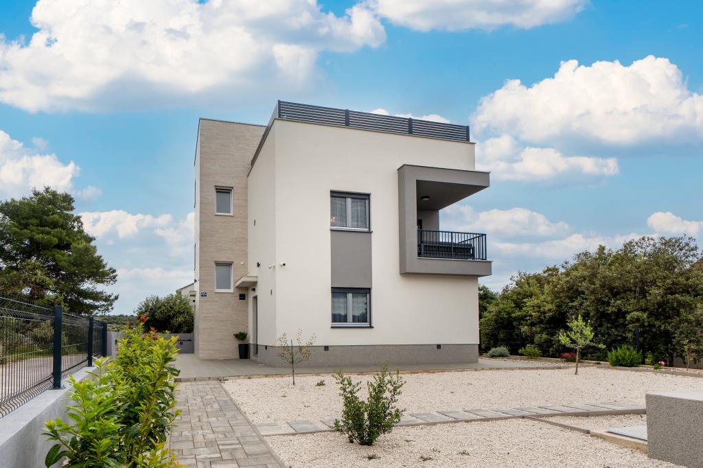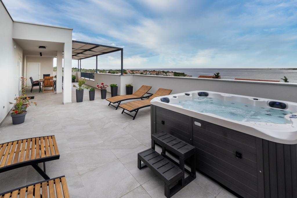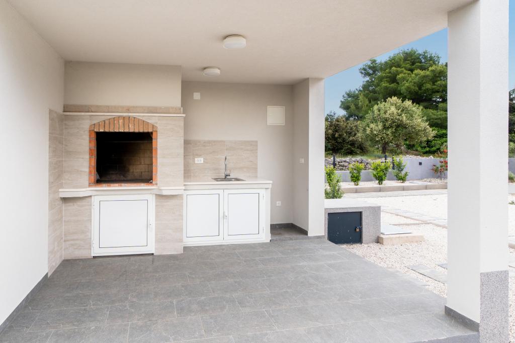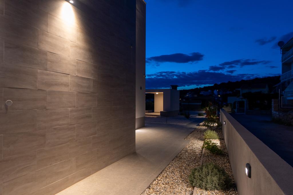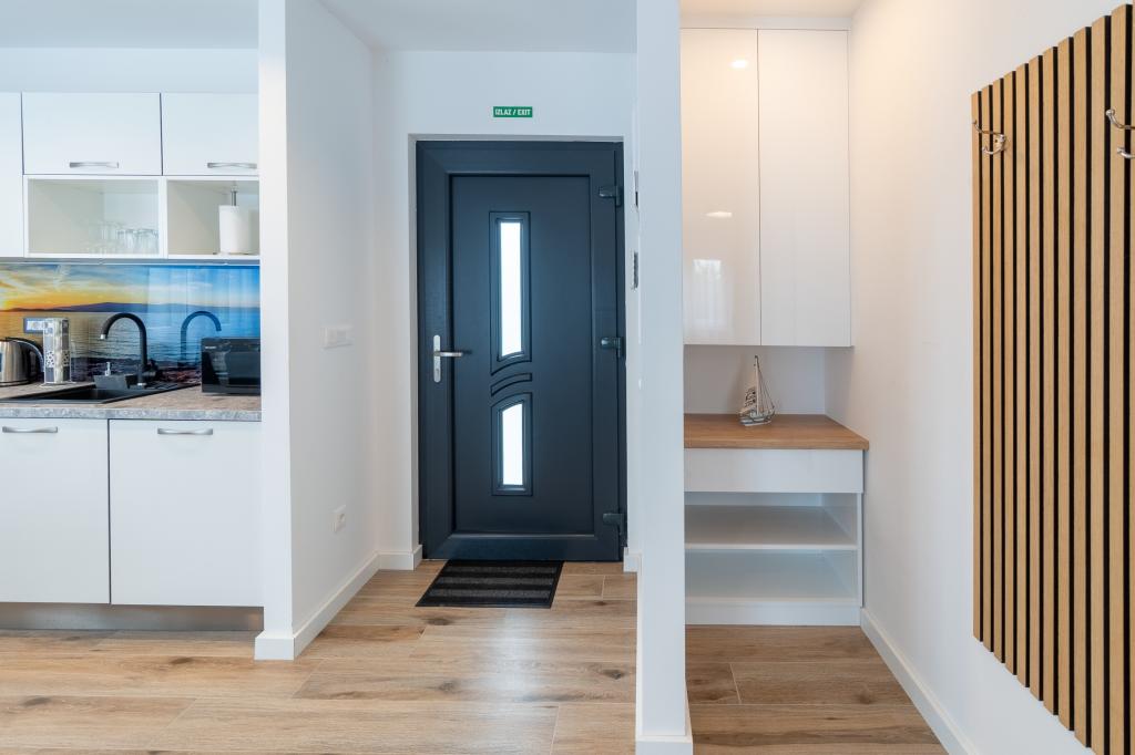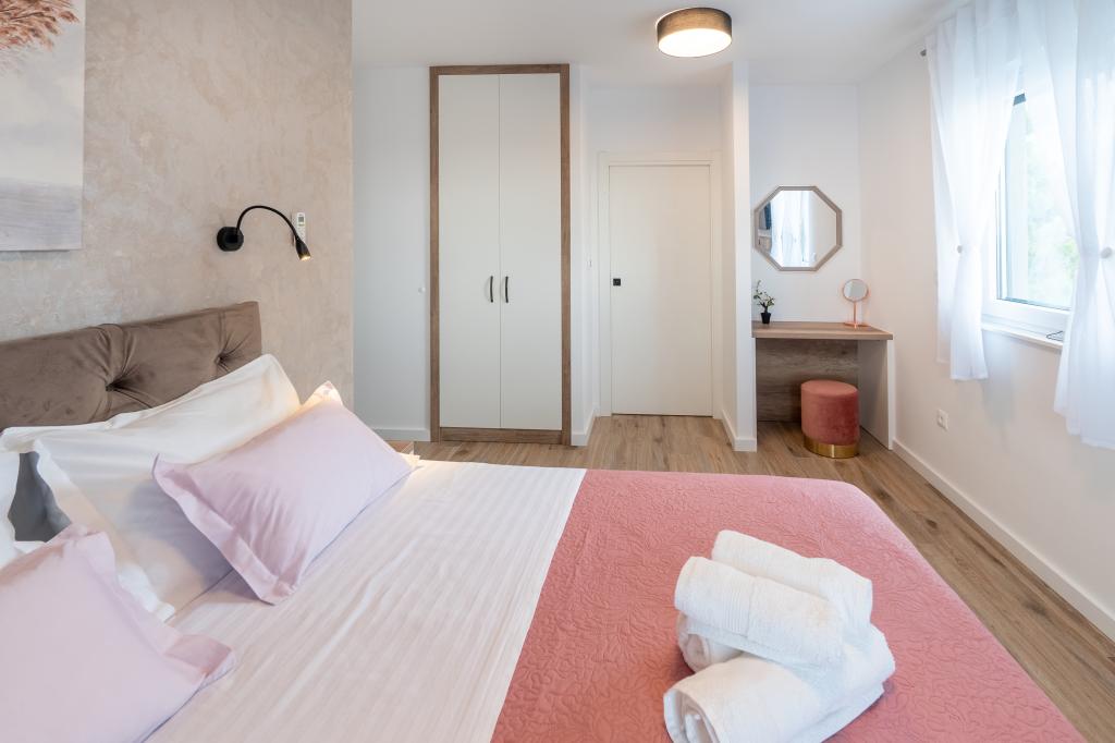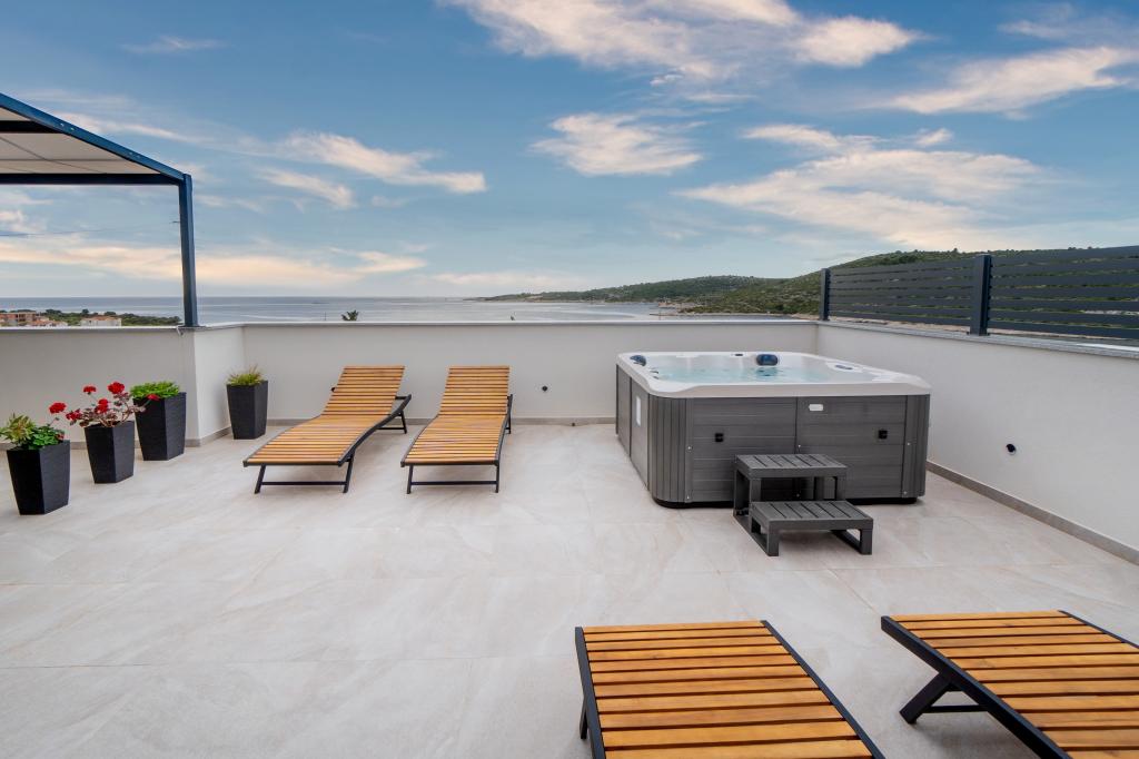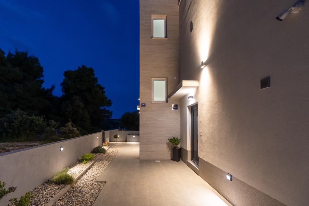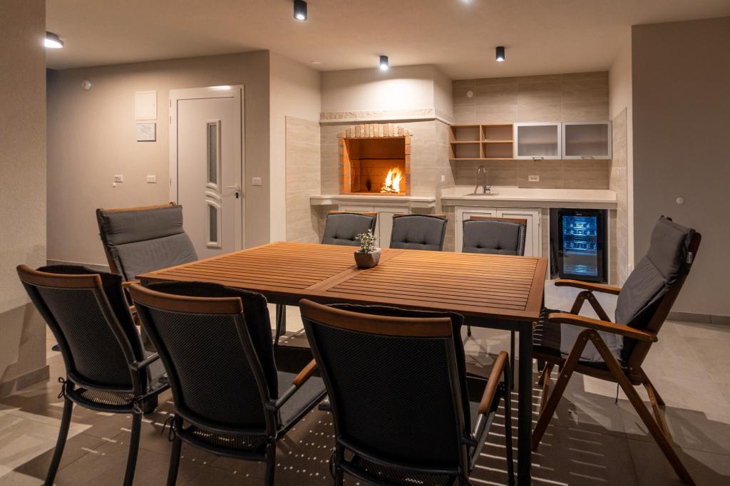Nowy obiekt. Ciesz się z rodziną w tym nowoczesnym obiekcie z pięknym zachodem słońca i widokiem na morze. Cicha okolica. Dwa apartamenty wynajmowane w całości. Na parterze znajduje się apartament typu studio składający się z kuchni, łazienki i pokoju z łóżkiem małżeńskim, w salonie znajduje się również dodatkowe łóżko. Na pierwszym piętrze znajduje się duży apartament składający się z kuchni, salonu, balkonu z meblami ogrodowymi idealnymi na poranną kawę, dwóch pokoi z łóżkiem małżeńskim i jednego pokoju z dwoma oddzielnymi łóżkami, które w razie potrzeby można połączyć. Mieszkanie to posiada dwie łazienki, z czego jedna jest częścią pokoju, a druga toaleta. Na drugim piętrze budynku znajduje się duży taras z widokiem na cały lokal oraz wanna z hydromasażem dla 5 osób, leżaki do opalania, grill, kuchnia letnia oraz stół i krzesła. Na zewnątrz znajduje się również mniejszy zadaszony obiekt z grillem oraz stołem i ławkami.