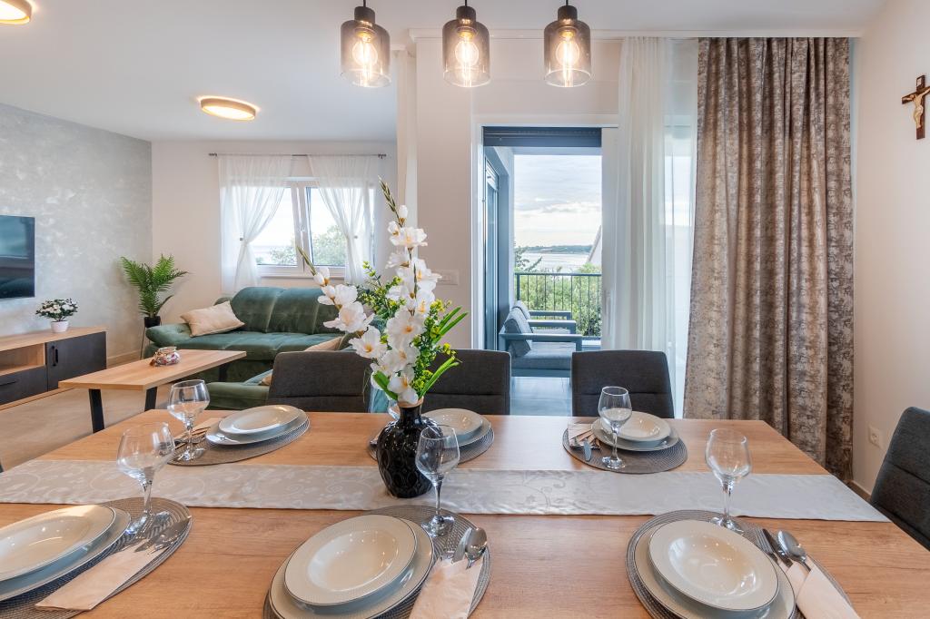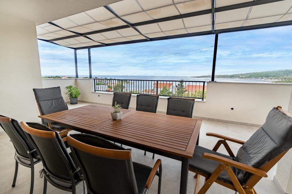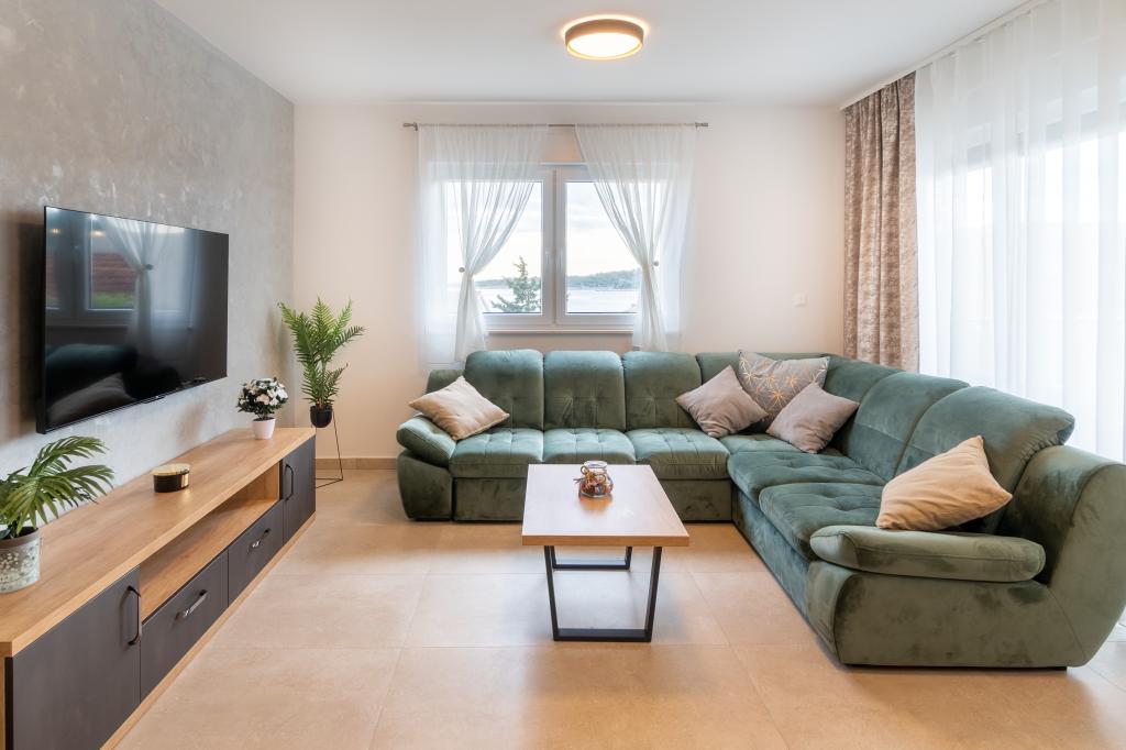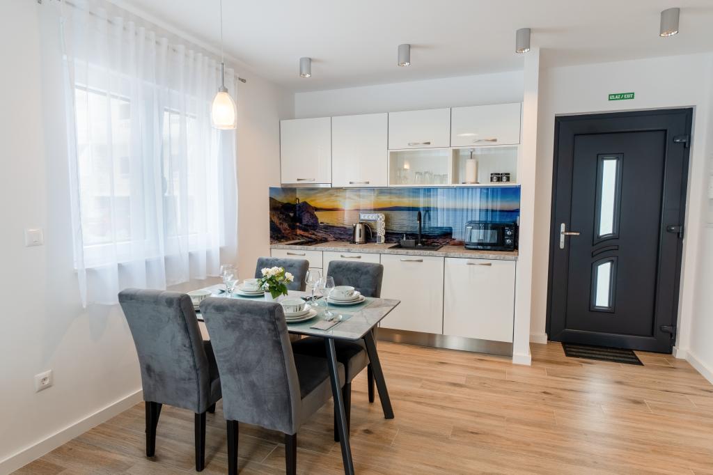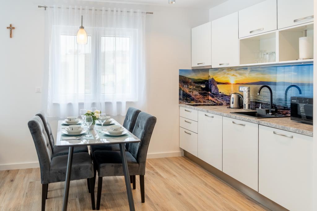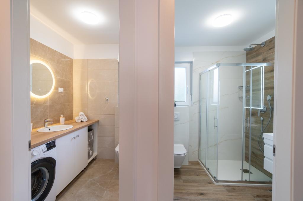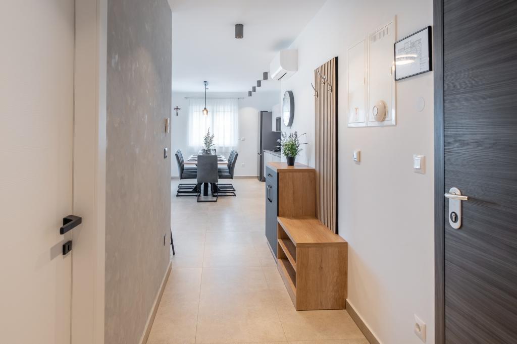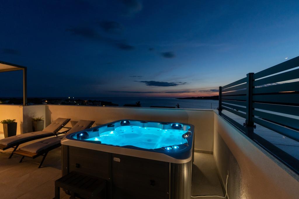 Nowy obiekt. Ciesz się z rodziną w tym nowoczesnym obiekcie z pięknym zachodem słońca i widokiem na morze. Cicha okolica. Dwa apartamenty wynajmowane w całości. Na parterze znajduje się apartament typu studio składający się z kuchni, łazienki i pokoju z łóżkiem małżeńskim, w salonie znajduje się również dodatkowe łóżko. Na pierwszym piętrze znajduje się duży apartament składający się z kuchni, salonu, balkonu z meblami ogrodowymi idealnymi na poranną kawę, dwóch pokoi z łóżkiem małżeńskim i jednego pokoju z dwoma oddzielnymi łóżkami, które w razie potrzeby można połączyć. Mieszkanie to posiada dwie łazienki, z czego jedna jest częścią pokoju, a druga toaleta. Na drugim piętrze budynku znajduje się duży taras z widokiem na cały lokal oraz wanna z hydromasażem dla 5 osób, leżaki do opalania, grill, kuchnia letnia oraz stół i krzesła. Na zewnątrz znajduje się również mniejszy zadaszony obiekt z grillem oraz stołem i ławkami.