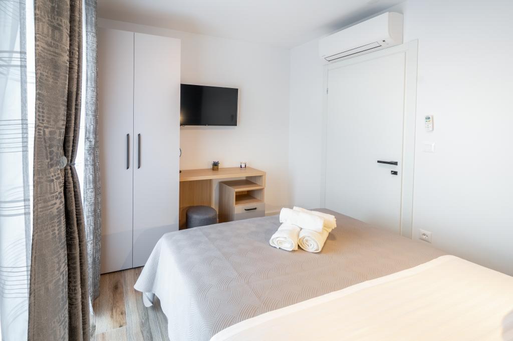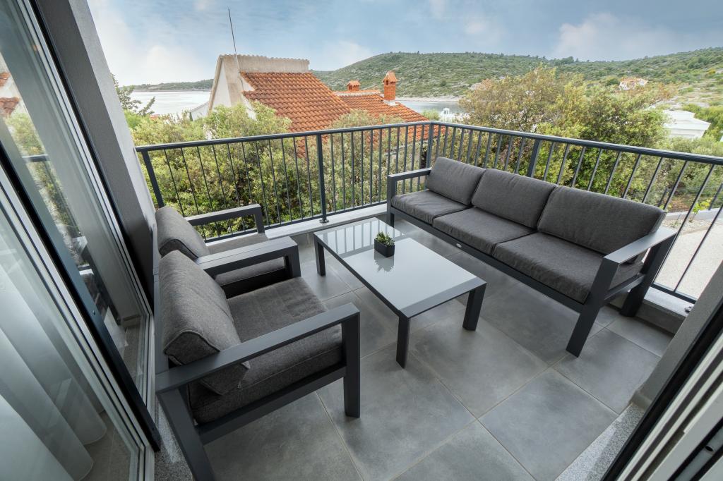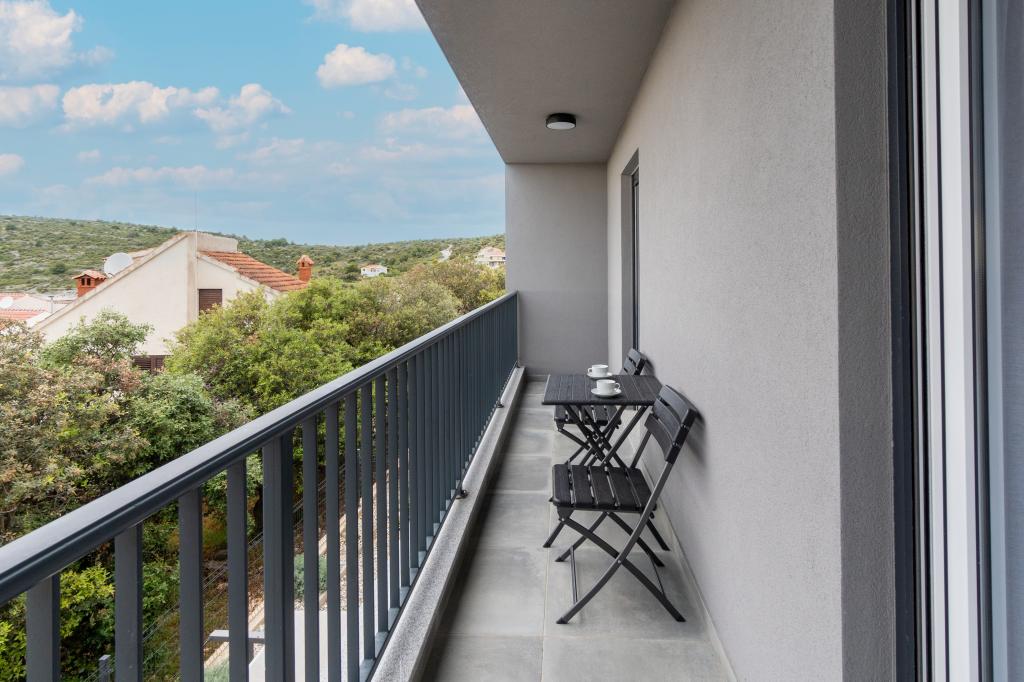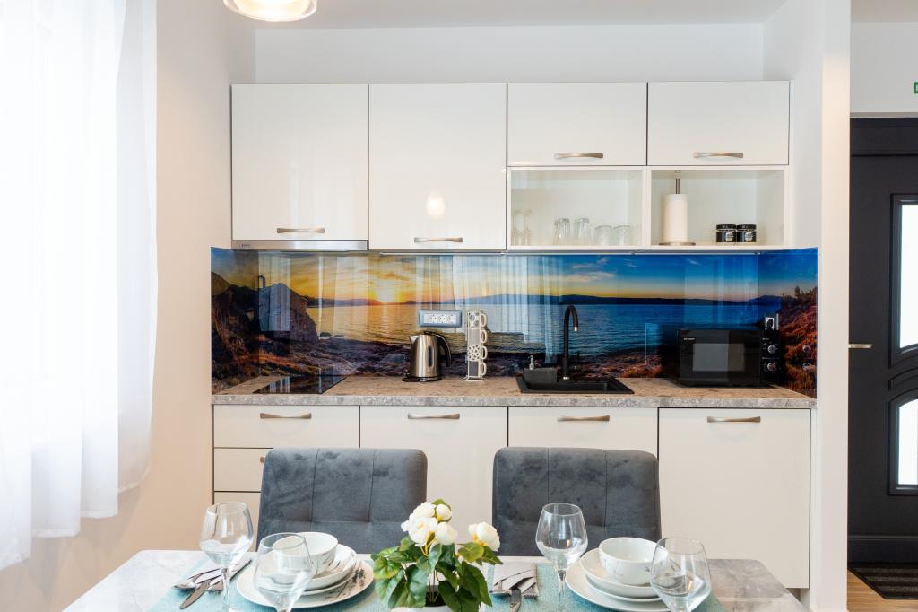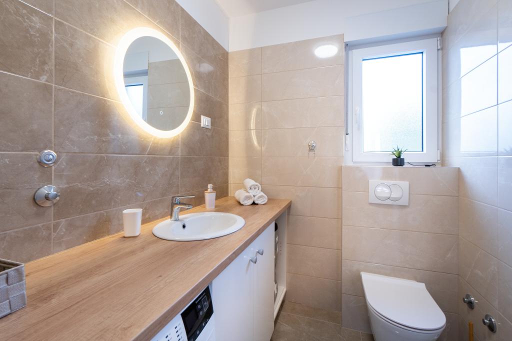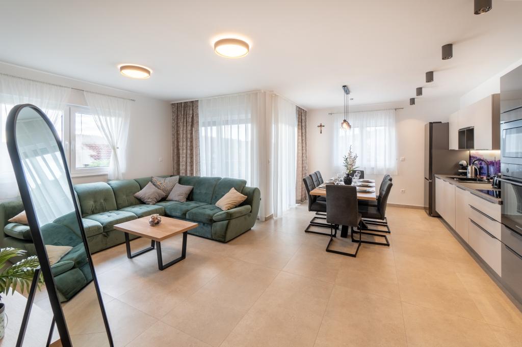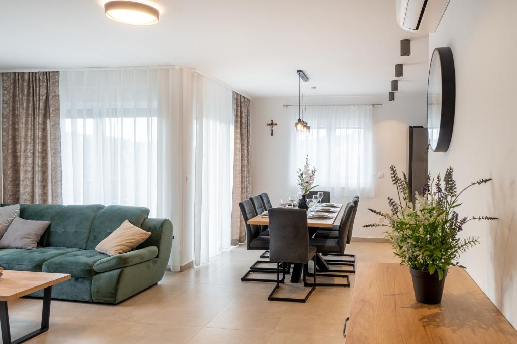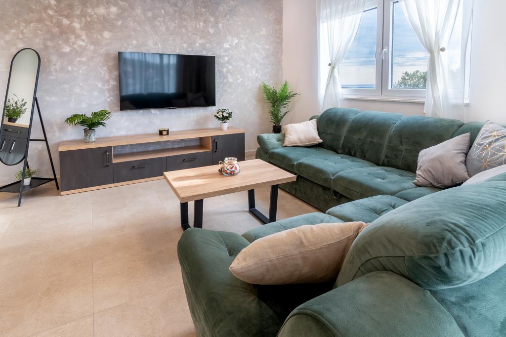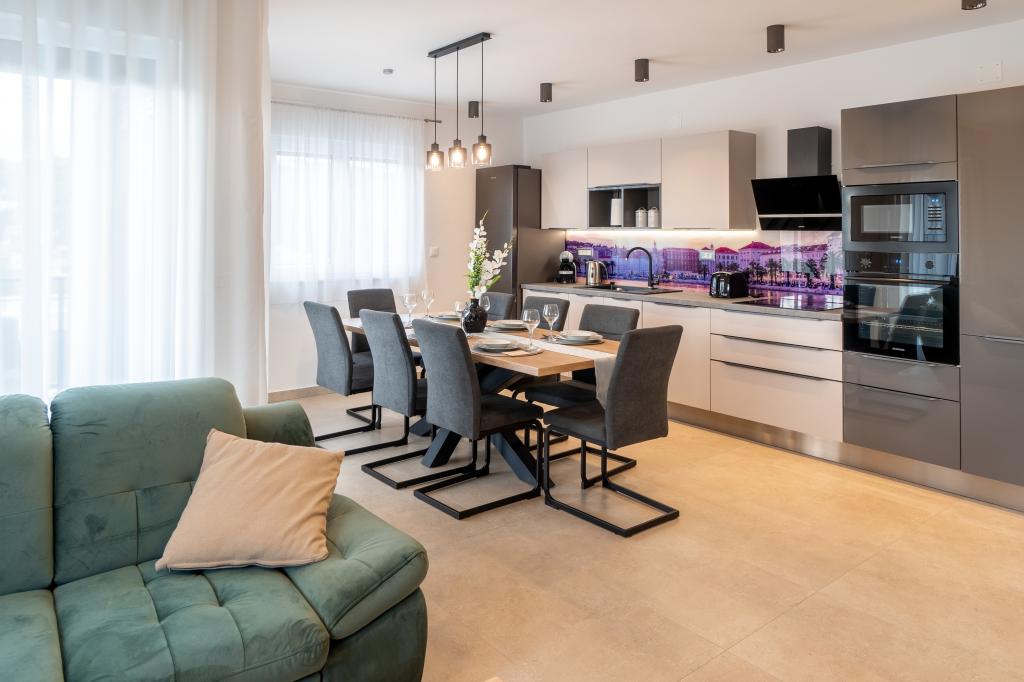 Nowy obiekt. Ciesz się z rodziną w tym nowoczesnym obiekcie z pięknym zachodem słońca i widokiem na morze. Cicha okolica. Dwa apartamenty wynajmowane w całości. Na parterze znajduje się apartament typu studio składający się z kuchni, łazienki i pokoju z łóżkiem małżeńskim, w salonie znajduje się również dodatkowe łóżko. Na pierwszym piętrze znajduje się duży apartament składający się z kuchni, salonu, balkonu z meblami ogrodowymi idealnymi na poranną kawę, dwóch pokoi z łóżkiem małżeńskim i jednego pokoju z dwoma oddzielnymi łóżkami, które w razie potrzeby można połączyć. Mieszkanie to posiada dwie łazienki, z czego jedna jest częścią pokoju, a druga toaleta. Na drugim piętrze budynku znajduje się duży taras z widokiem na cały lokal oraz wanna z hydromasażem dla 5 osób, leżaki do opalania, grill, kuchnia letnia oraz stół i krzesła. Na zewnątrz znajduje się również mniejszy zadaszony obiekt z grillem oraz stołem i ławkami.