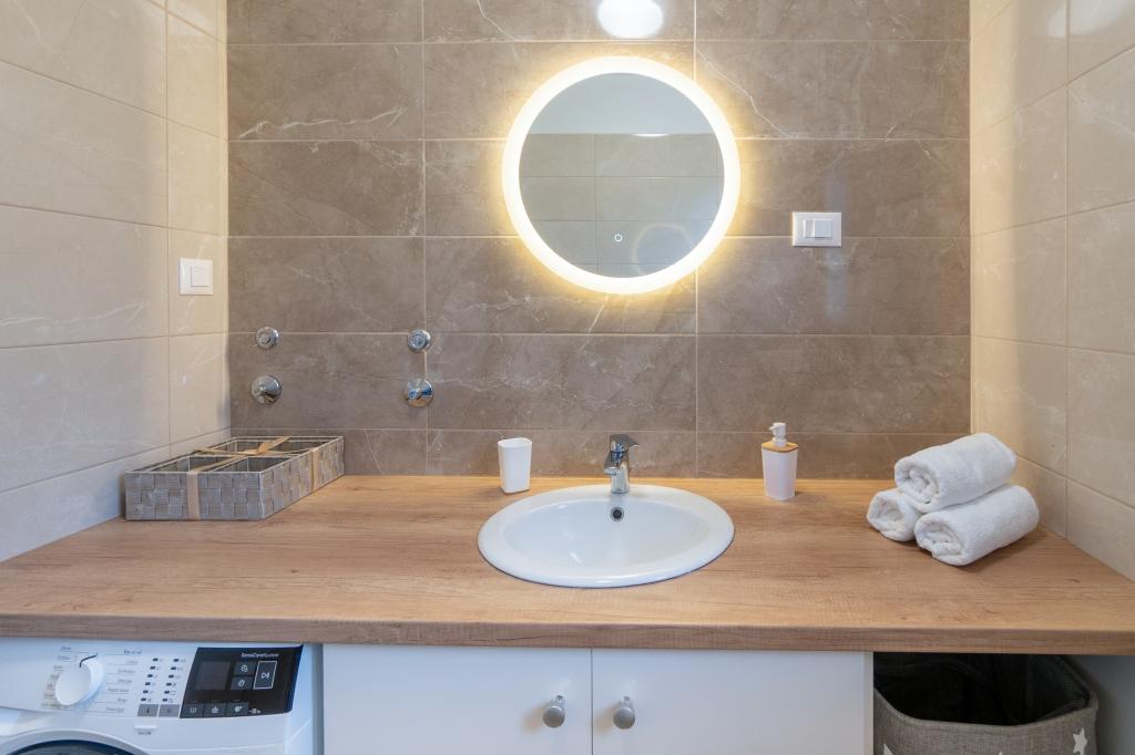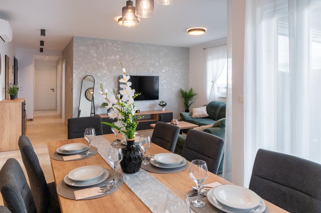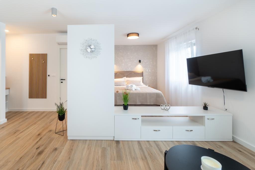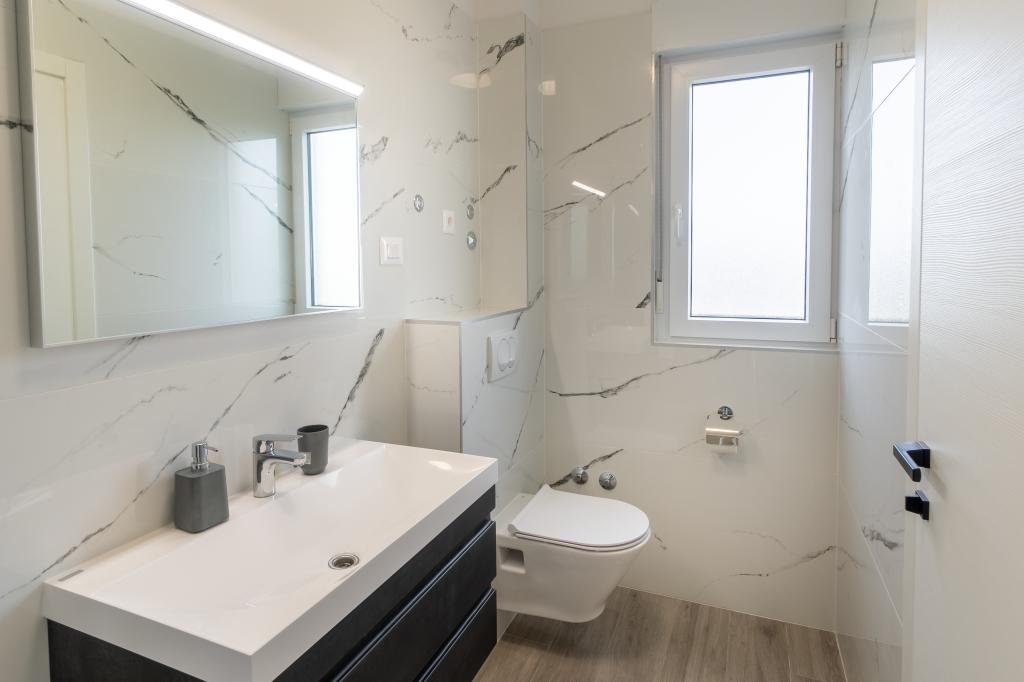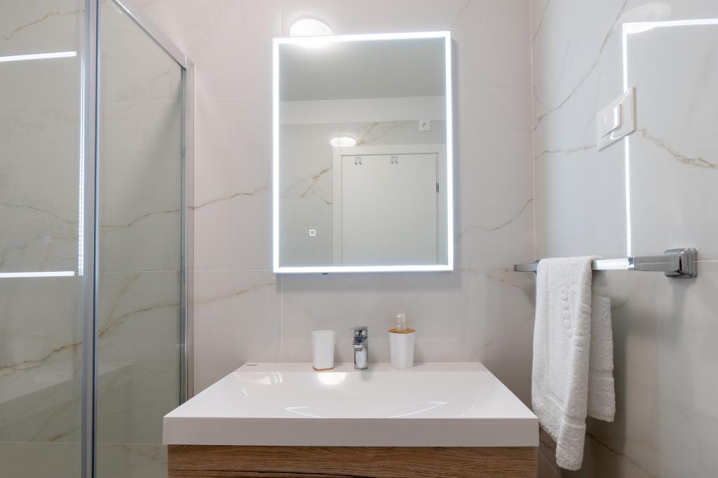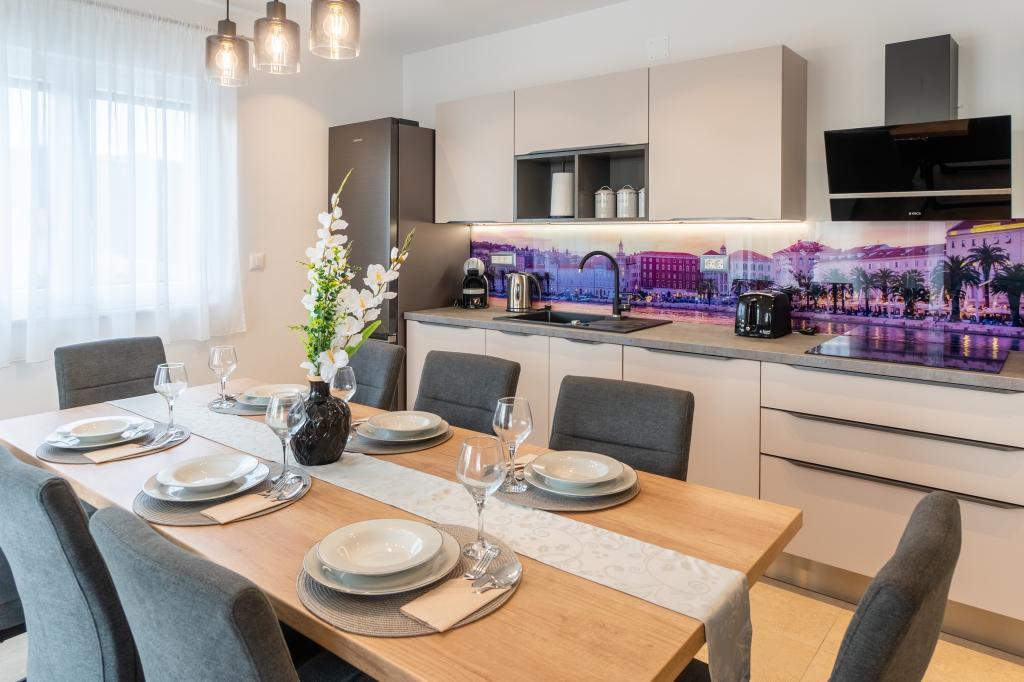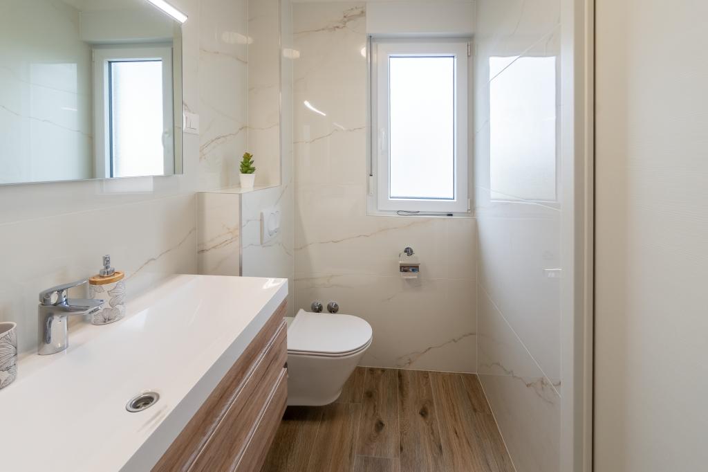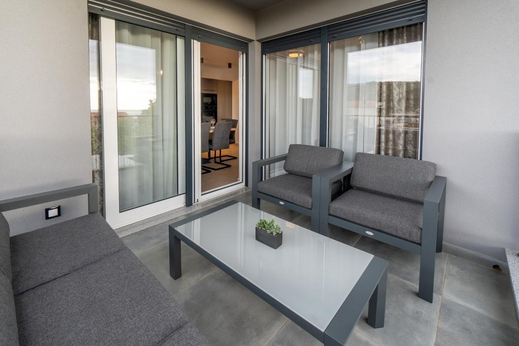 Nowy obiekt. Ciesz się z rodziną w tym nowoczesnym obiekcie z pięknym zachodem słońca i widokiem na morze. Cicha okolica. Dwa apartamenty wynajmowane w całości. Na parterze znajduje się apartament typu studio składający się z kuchni, łazienki i pokoju z łóżkiem małżeńskim, w salonie znajduje się również dodatkowe łóżko. Na pierwszym piętrze znajduje się duży apartament składający się z kuchni, salonu, balkonu z meblami ogrodowymi idealnymi na poranną kawę, dwóch pokoi z łóżkiem małżeńskim i jednego pokoju z dwoma oddzielnymi łóżkami, które w razie potrzeby można połączyć. Mieszkanie to posiada dwie łazienki, z czego jedna jest częścią pokoju, a druga toaleta. Na drugim piętrze budynku znajduje się duży taras z widokiem na cały lokal oraz wanna z hydromasażem dla 5 osób, leżaki do opalania, grill, kuchnia letnia oraz stół i krzesła. Na zewnątrz znajduje się również mniejszy zadaszony obiekt z grillem oraz stołem i ławkami.