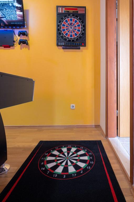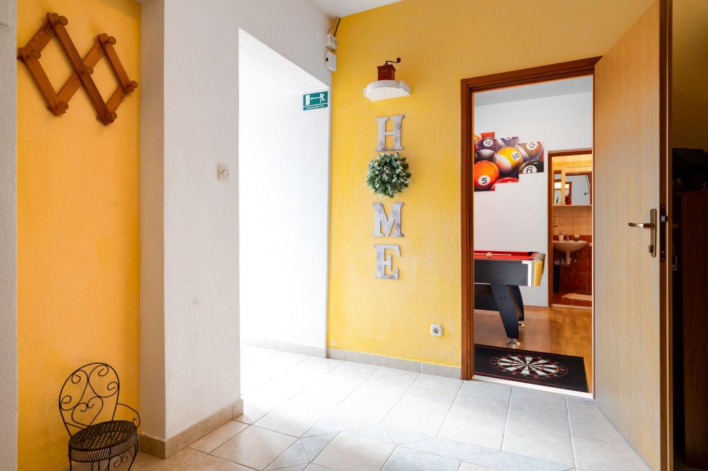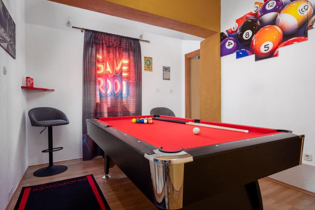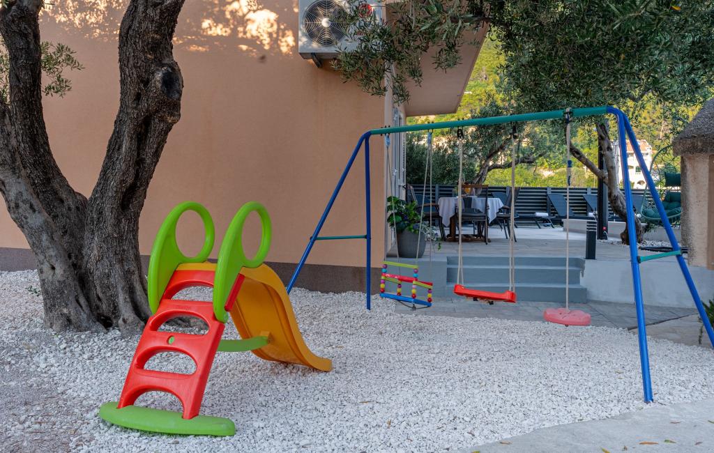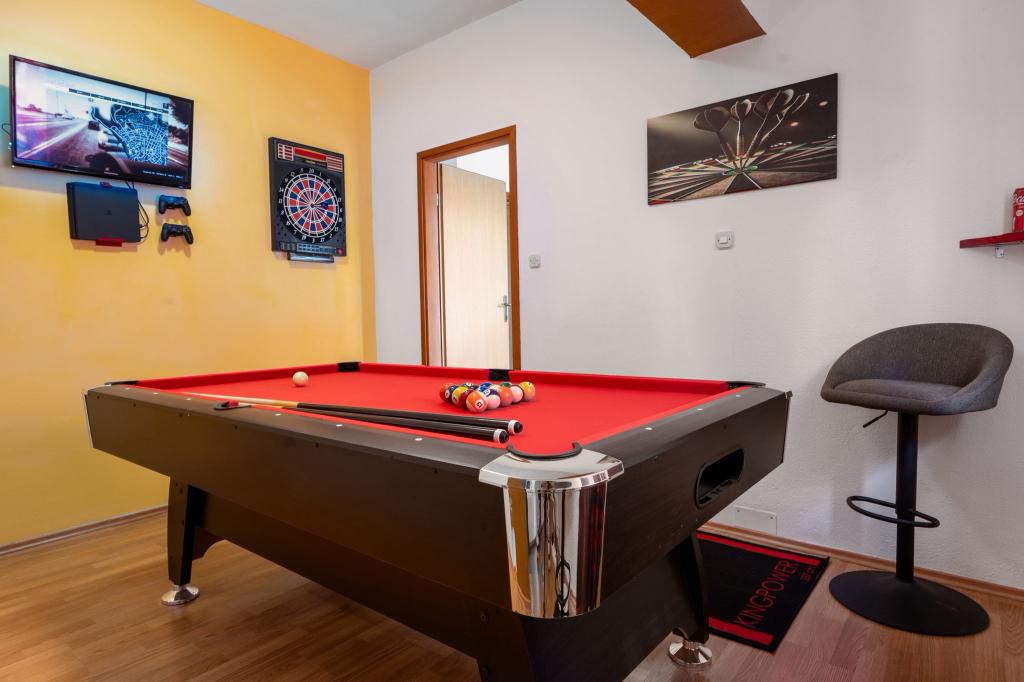 Ten dom wakacyjny, który oferuje łącznie 350 metrów kwadratowych powierzchni użytkowej, jest idealny na wymarzone wakacje, szczególnie jeśli podróżujesz z dziećmi. Staraliśmy się, aby zarówno dorośli, jak i dzieci mogli mieć zainteresowania i spędzić miło czas, aby mogli spędzić swój coroczny urlop w relaksie. Oprócz tego, że w domu oferujemy pokój gier z bilardem, rzutkami i PlayStation, na zewnątrz znajdują się również huśtawki i zjeżdżalnia dla dzieci, a jeśli to nie wystarczy, jest plac zabaw, na którym można grać w koszykówkę lub piłkę nożną, zaledwie 50 m od budynku. Ten dom wakacyjny oferuje również zewnętrzny kominek do wieczornych spotkań towarzyskich i relaksu przy basenie. Jeśli przyjeżdżasz ze znajomymi lub rodziną, zapewniliśmy również oddzielne kuchnie, pokoje i łazienki. Makarska znajduje się w odległości 2 km i oferuje również jednodniowe wycieczki na wyspy Hvar, Brac i Korcula. Dom znajduje się w cichym miejscu z widokiem na całą Makarską.