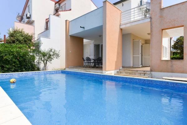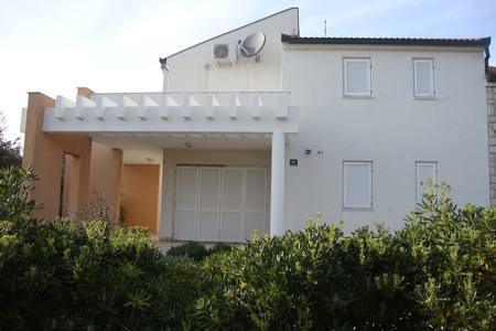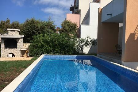 Piękny dom z basenem na wyspie Pag (miejsce Mandre), 200 metrów od morza. Znajduje się w spokojnej okolicy, w otoczeniu innych domów rodzinnych. Nieruchomość posiada basen 8 x 4 m, pięknie zagospodarowany dziedziniec, taras, miejsce do opalania, grill i parking. Na parterze budynku znajduje się przestronny salon z kuchnią, łazienką, garażem i spiżarnią. Na parterze znajdują się cztery pokoje, w tym trzy z podwójnymi łóżkami i jeden z dwoma mniejszymi łóżkami. Na parterze znajduje się również osobna łazienka i duży taras. Obiekt może pomieścić do 8 osób dorosłych na piętrze, a dwa kolejne na parterze (tapicerowana kanapa). Dom jest idealnym miejscem na spokojne rodzinne wakacje i jest w pełni i nowocześnie wyposażony, aby zapewnić przyjemny pobyt.
