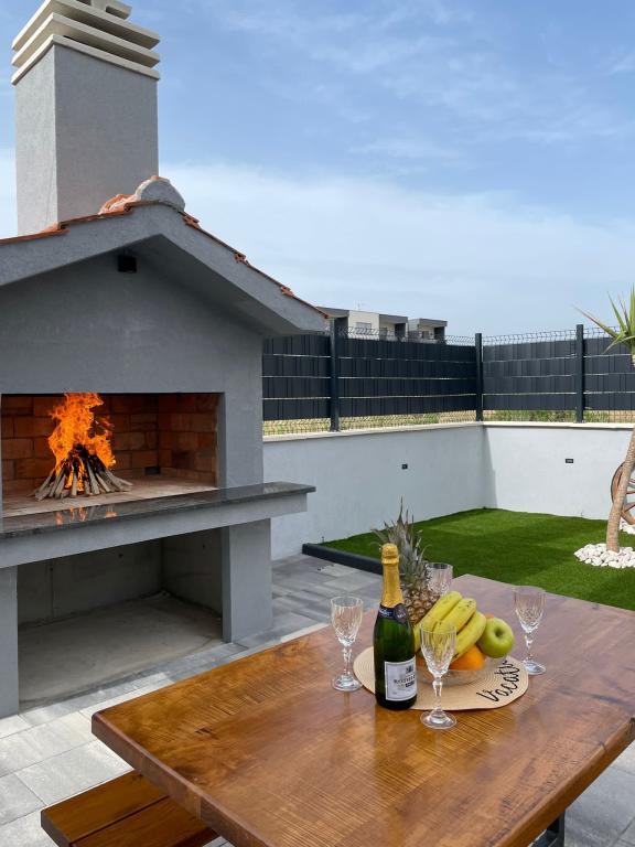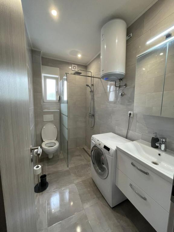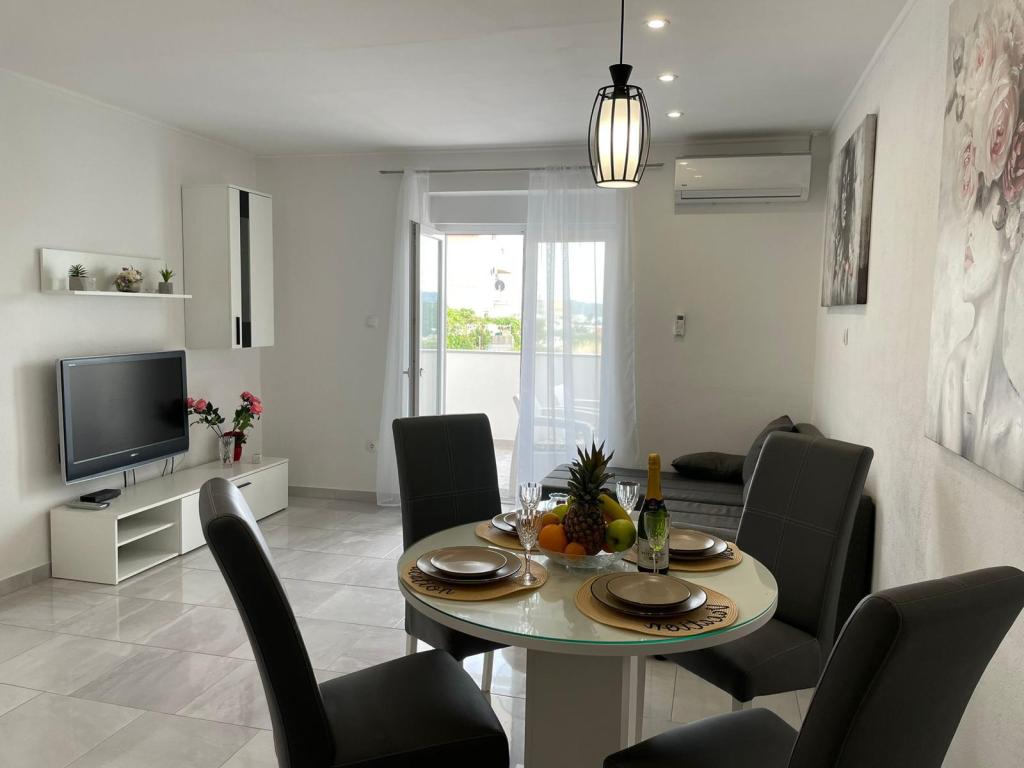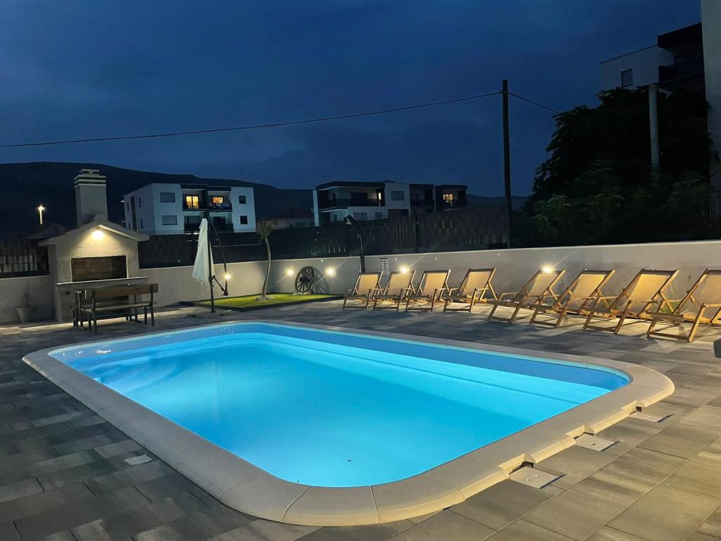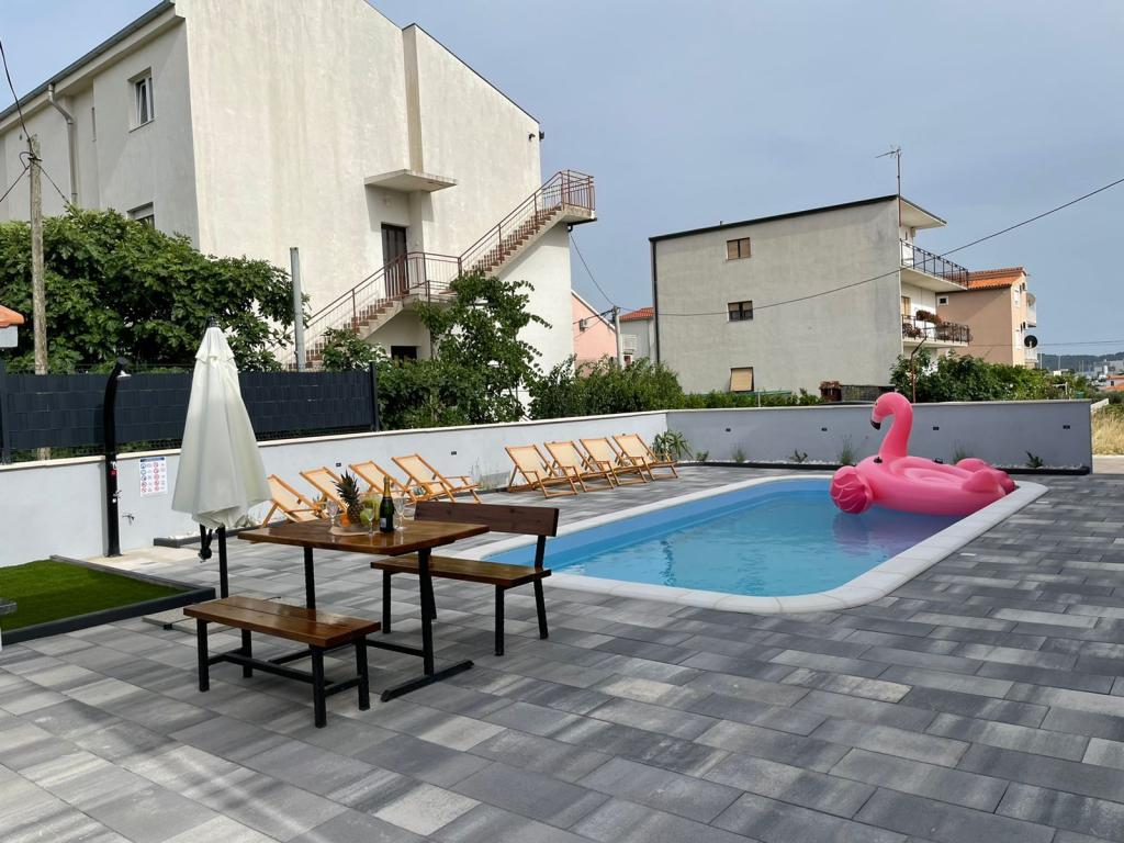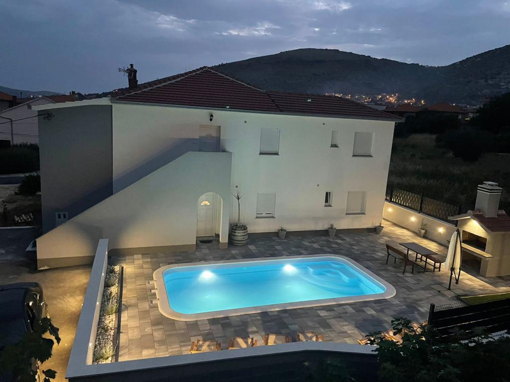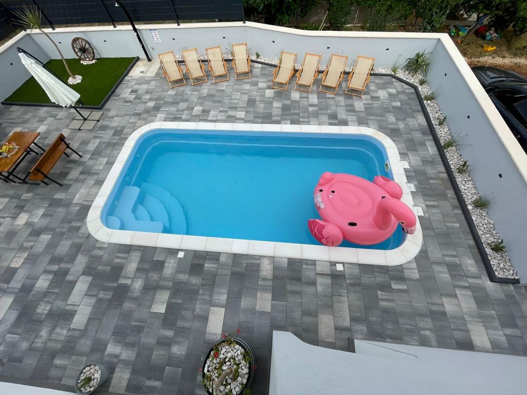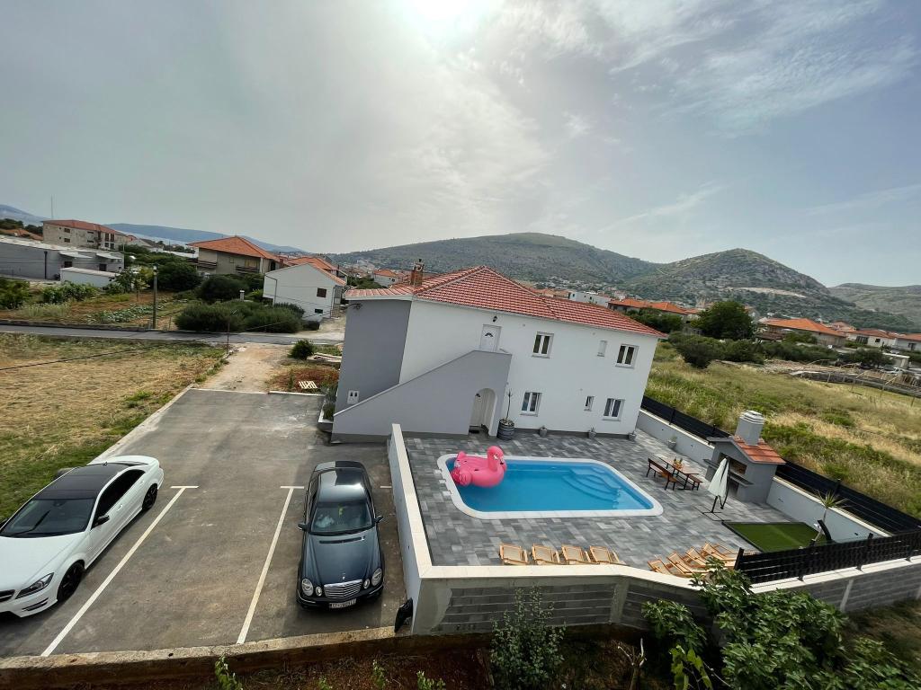 Nowo umeblowana willa w Seget Donji. 65 metrów kwadratowych i duży balkon o powierzchni 15 metrów kwadratowych, który jest półzamknięty. Budynek posiada jedną łazienkę, dwie sypialnie z podwójnymi łóżkami. Willa posiada ogród o powierzchni 168 metrów kwadratowych, basen 30 metrów kwadratowych, grill na świeżym powietrzu, leżaki do odpoczynku, bramki do gry w polo na basen.