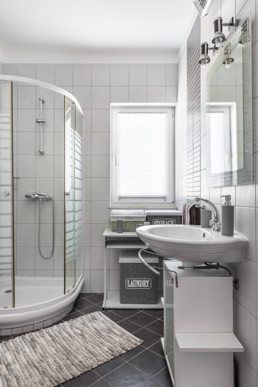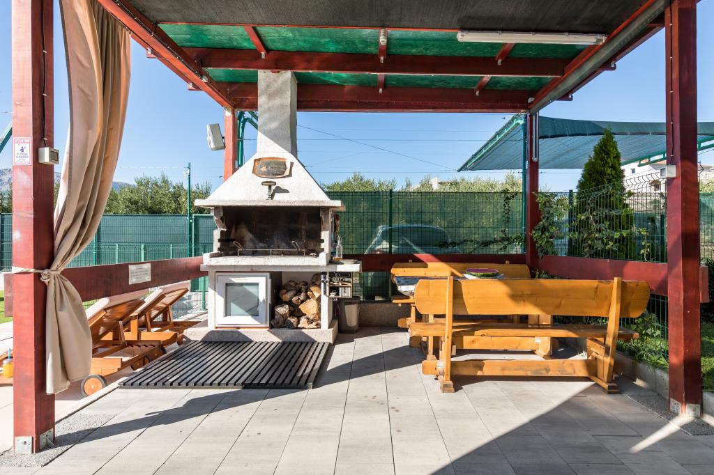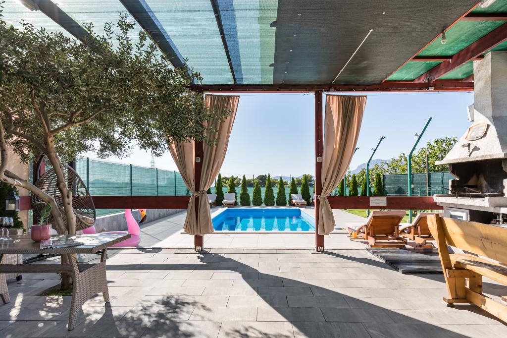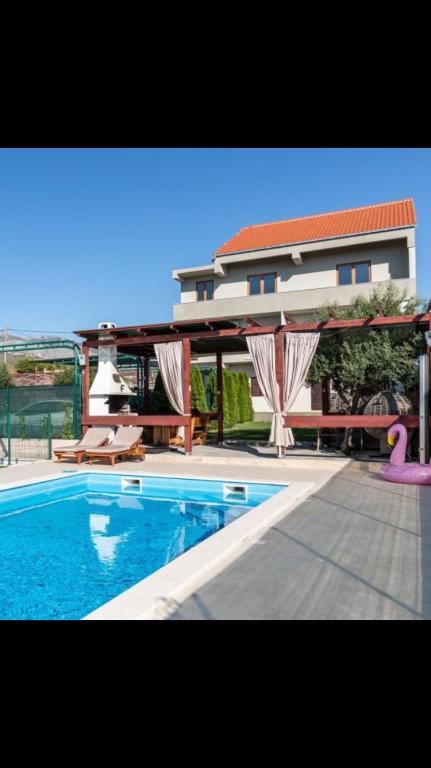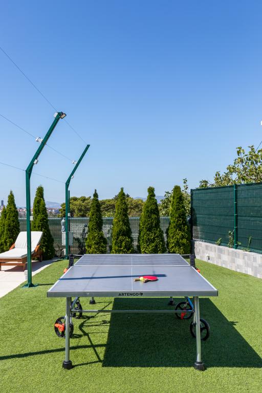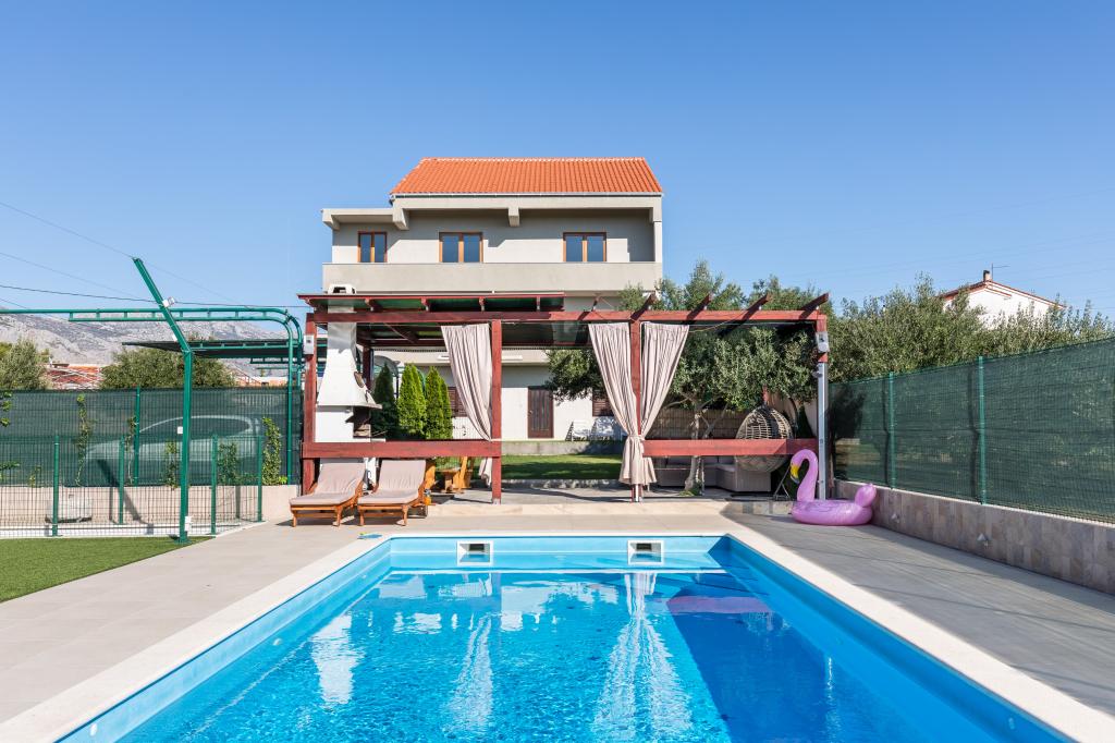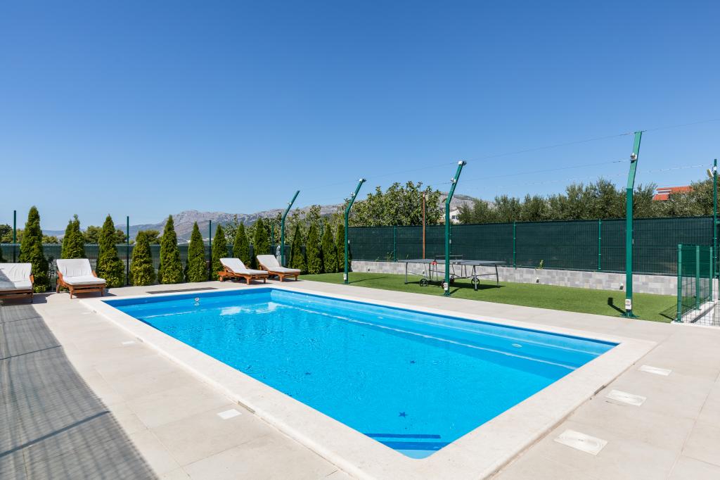 Willa z basenem 8x4 m, ogrodem 180 m kw., siłownia z pinballem i grami wideo, prywatny parking na 5 samochodów, miejsce przy basenie do tenisa stołowego na miękkiej sztucznej trawie, piwnica 50 m kw. na nocne imprezy z bilardem i dużym TV od 75 cali, gdzie możesz oglądać Netflixa lub słuchać muzyki przez wzmacniacze i surfować do woli przez bezprzewodowy internet. Willa posiada trzy oddzielne apartamenty z całym swoim wyposażeniem.Pomiędzy ogrodem a basenem znajduje się duża altana do grillowania i wypoczynku 8x4m.Cały teren tj. cała willa przeznaczona jest tylko dla gości i jest idealnym miejscem gdzie można zrelaksuj się i baw się w naturalnym gaju oliwnym z widokiem na cały Split, Kastelę, wzgórze Kozijak lub górę Mosor W pobliżu znajduje się kilka dużych centrów handlowych.