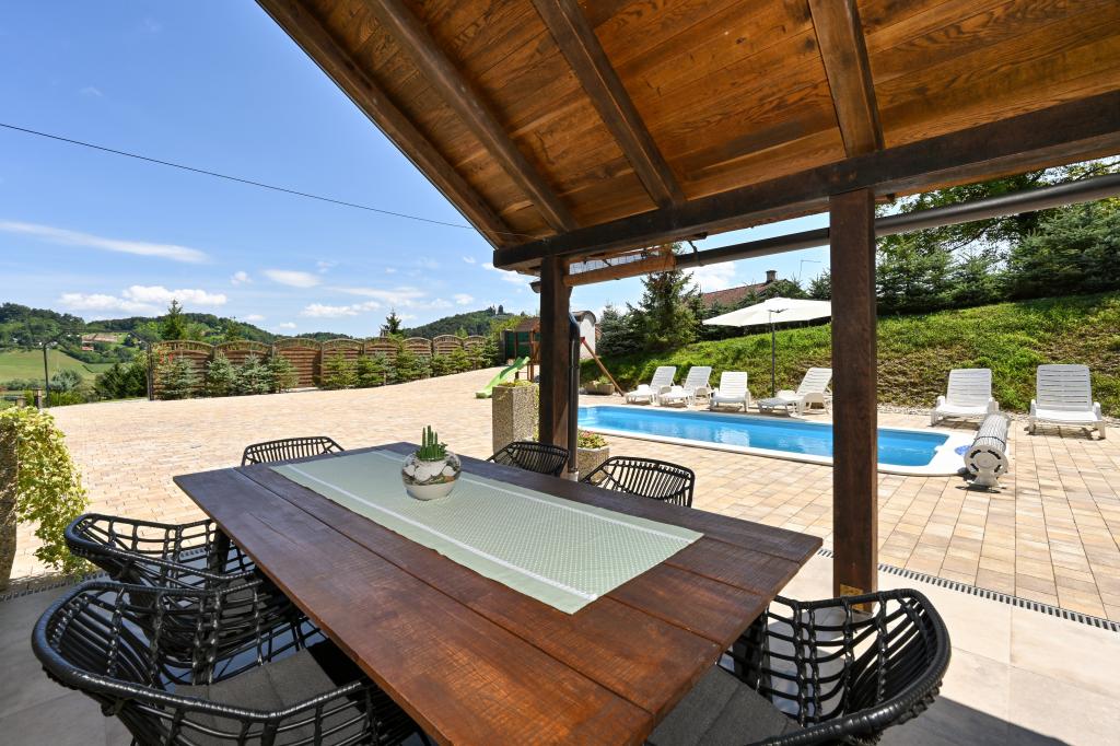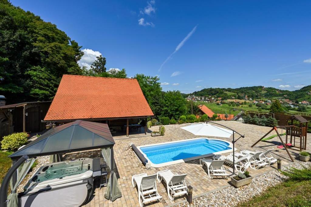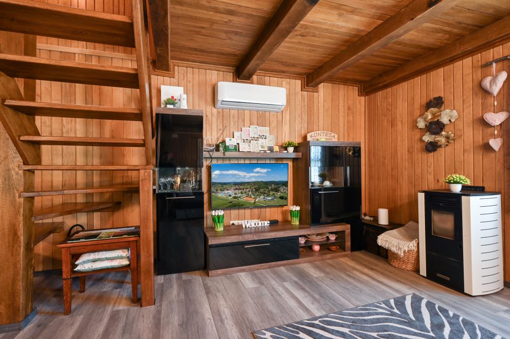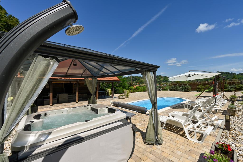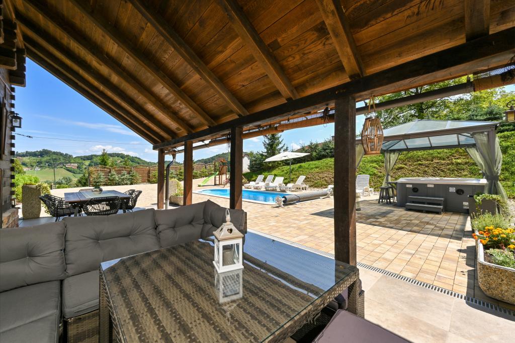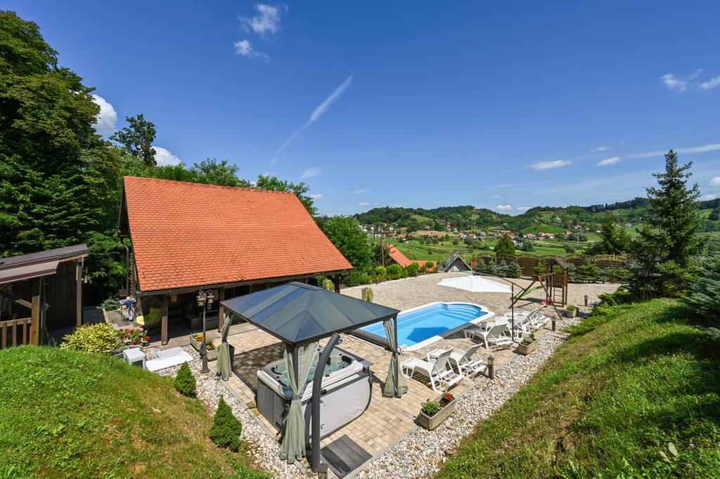 Jeśli chcesz sobie wyobrazić wakacje w najprawdziwszym tego słowa znaczeniu, położone na szczycie wzgórza, to idealnym miejscem, a jednocześnie ucieczką od zgiełku dnia codziennego, będzie dom wakacyjny Kontesa. Tutaj możesz całkowicie zostawić wszystko za sobą, oddać się tym, którzy cię uszczęśliwiają i cieszyć się dobrodziejstwami, jakie oferuje czysta przyroda i spokój regionu Zagorje. Ponieważ jedyne co będziesz mógł usłyszeć, to śpiew ptaków i szum wiatru w koronach drzew, a Twój wzrok będzie skierowany na otaczające Cię wzgórza, które zmieniają paletę barw w zależności od pory roku. Zatrzymamy Cię w czasie i damy Ci możliwość nawiązania kontaktu z rodziną, siedząc na przestronnym tarasie i pijąc poranną kawę lub czekając na zachód słońca i oglądając gwiazdy wieczorem. Zrelaksuj się na łonie natury w podgrzewanym basenie lub jacuzzi. Spotkaj się z dziećmi lub przyjaciółmi i zorganizujcie wspólnie grilla, zagrajcie w gry planszowe lub te dostępne w domu – możliwości jest wiele. A dom zrobiony z